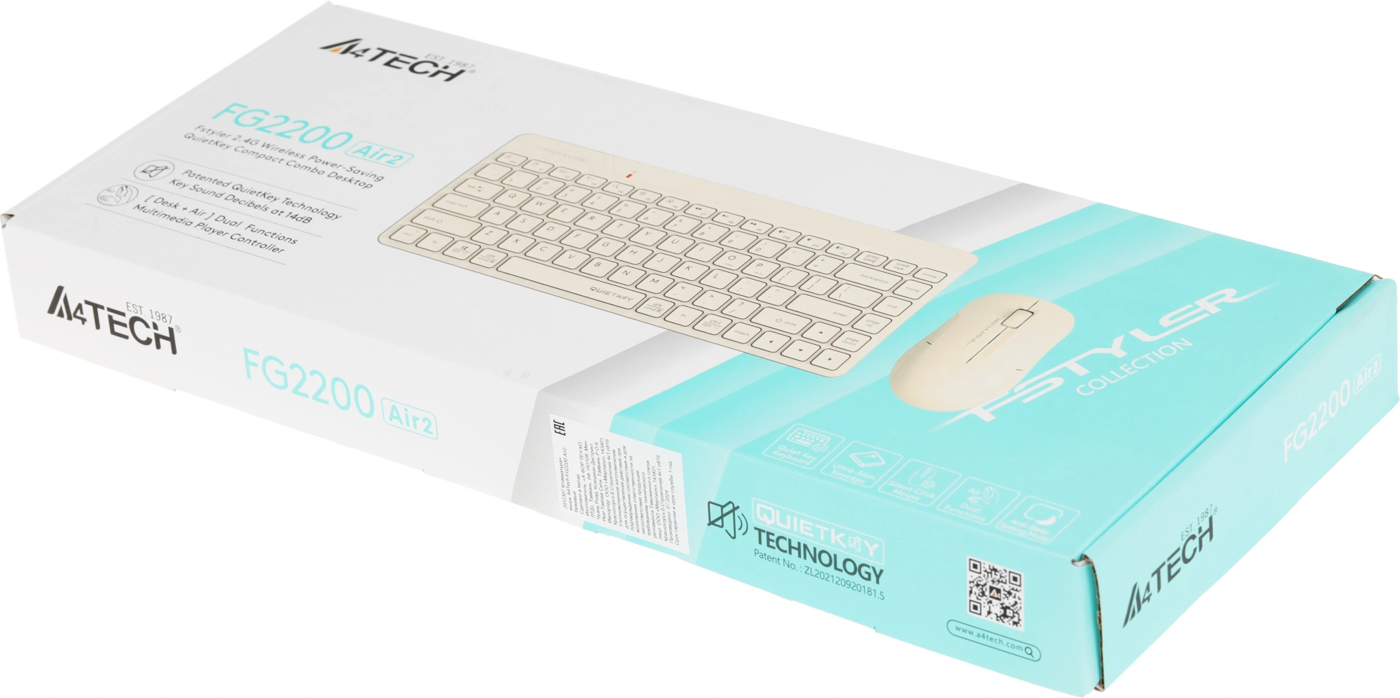 Комплект клавиатура/мышь A4Tech - FG2200 Air2, Беспроводной, 15 метров, USB, Optical, 4 mouse btns, keyboard waterproof, бежевый, FG2200 AIR2 BEIGE