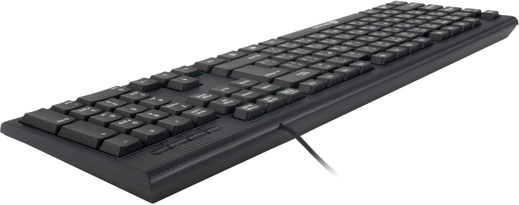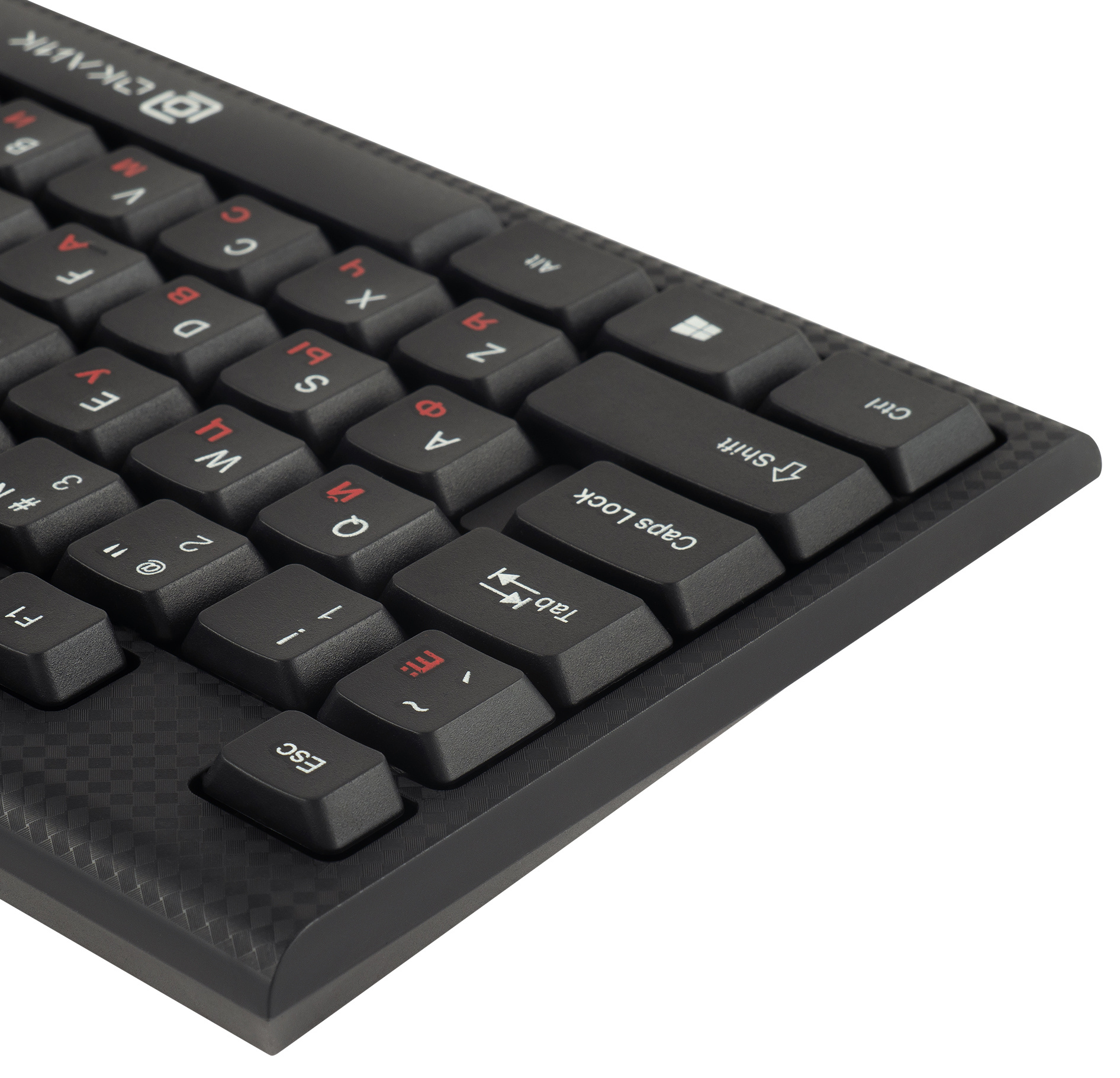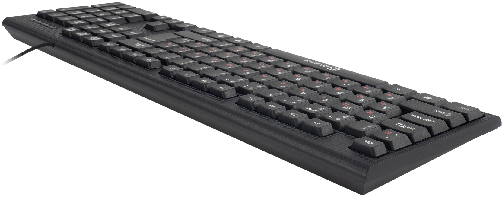 Тихая мембранная клавиатура, классический формат, а мышь с базовой оптикой. Проводной USB. Дизайн сдержанный, чёрный цвет. Надписи на клавишах контрастные.