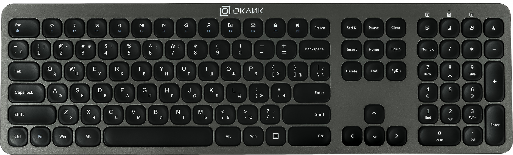 Выбрать товарыКомплект клавиатура/мышь OKLICK, Беспроводной, серый, 1488402