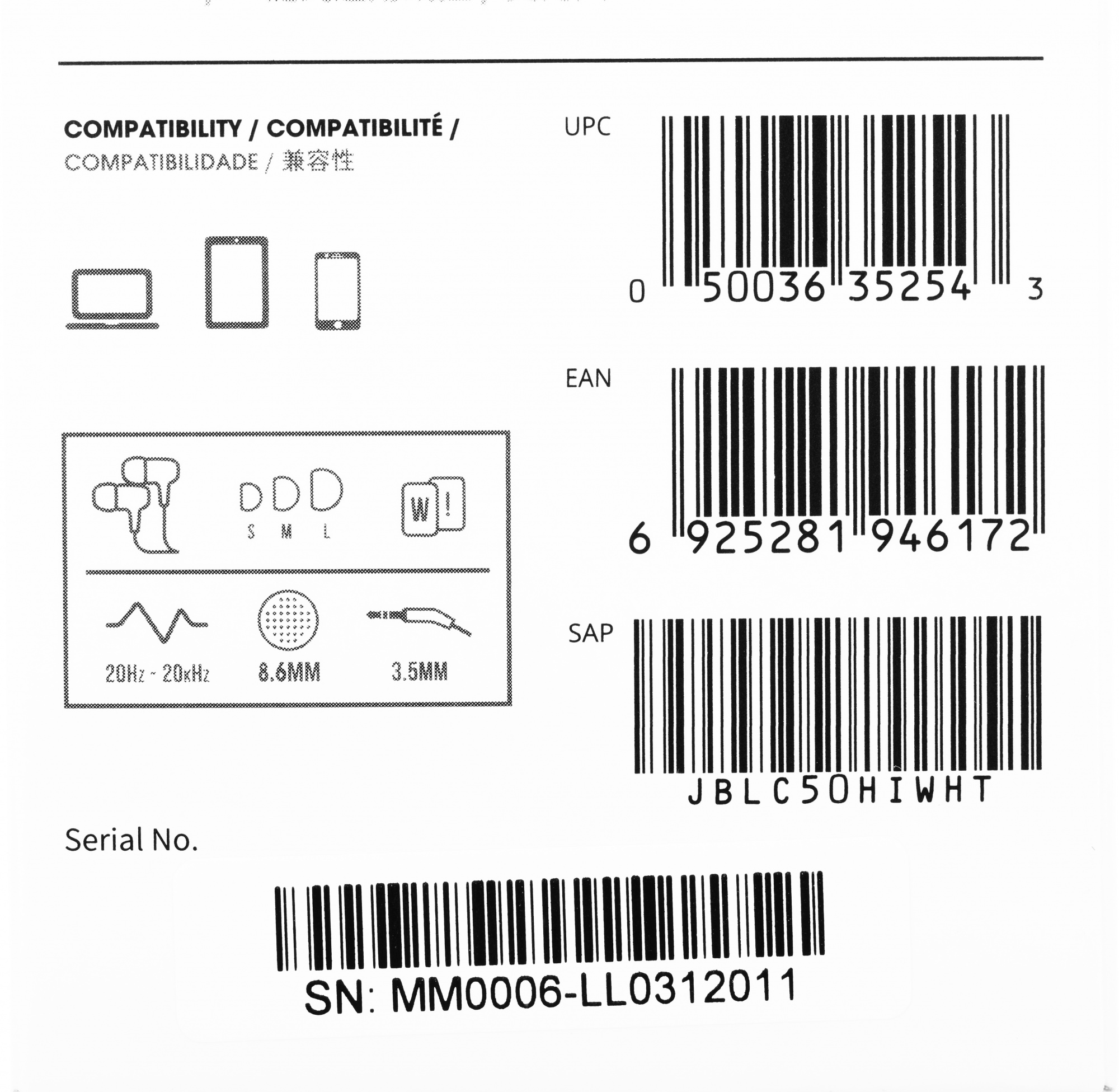 Наушники JBL - C50HI, Стерео, 3.5 мм, проводной, цвет белый, JBLC50HIWHT