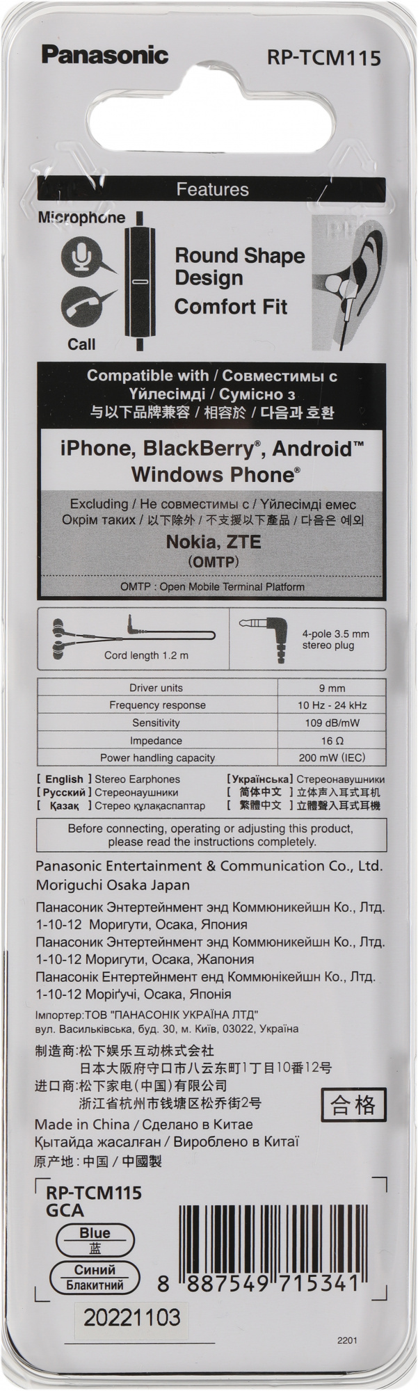 Наушники Panasonic - RP-TCM115GCA, Стерео, 3.5 мм, проводной, цвет синий, RP-TCM115GCA