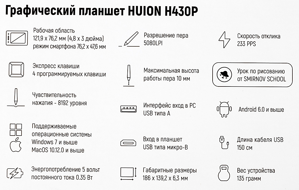 Компактный планшет для начинающих. Рабочая зона 5.6 дюймов подходит для ноутбуков. Перо с 4096 уровнями давления без батареек. Совместимость с Windows и Android. Толщина корпуса всего 8 мм. USB-подключение через micro-USB.