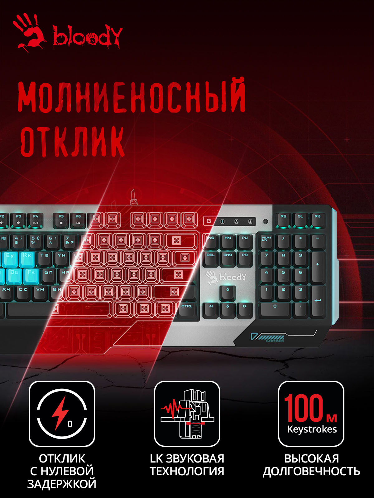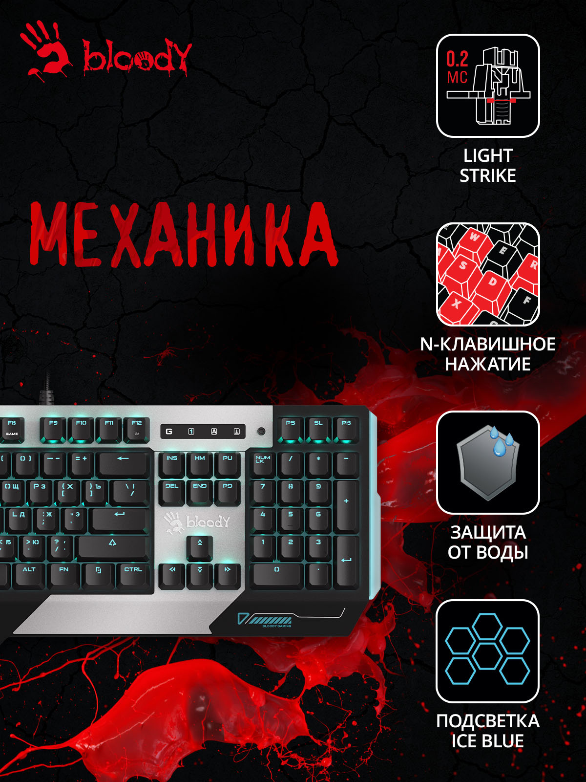 Клавиатура механическая A4Tech - Bloody B865, Проводная, USB, gaming, illumination keysnum pad,waterproof, цвет серый, B865 ICE BLUE