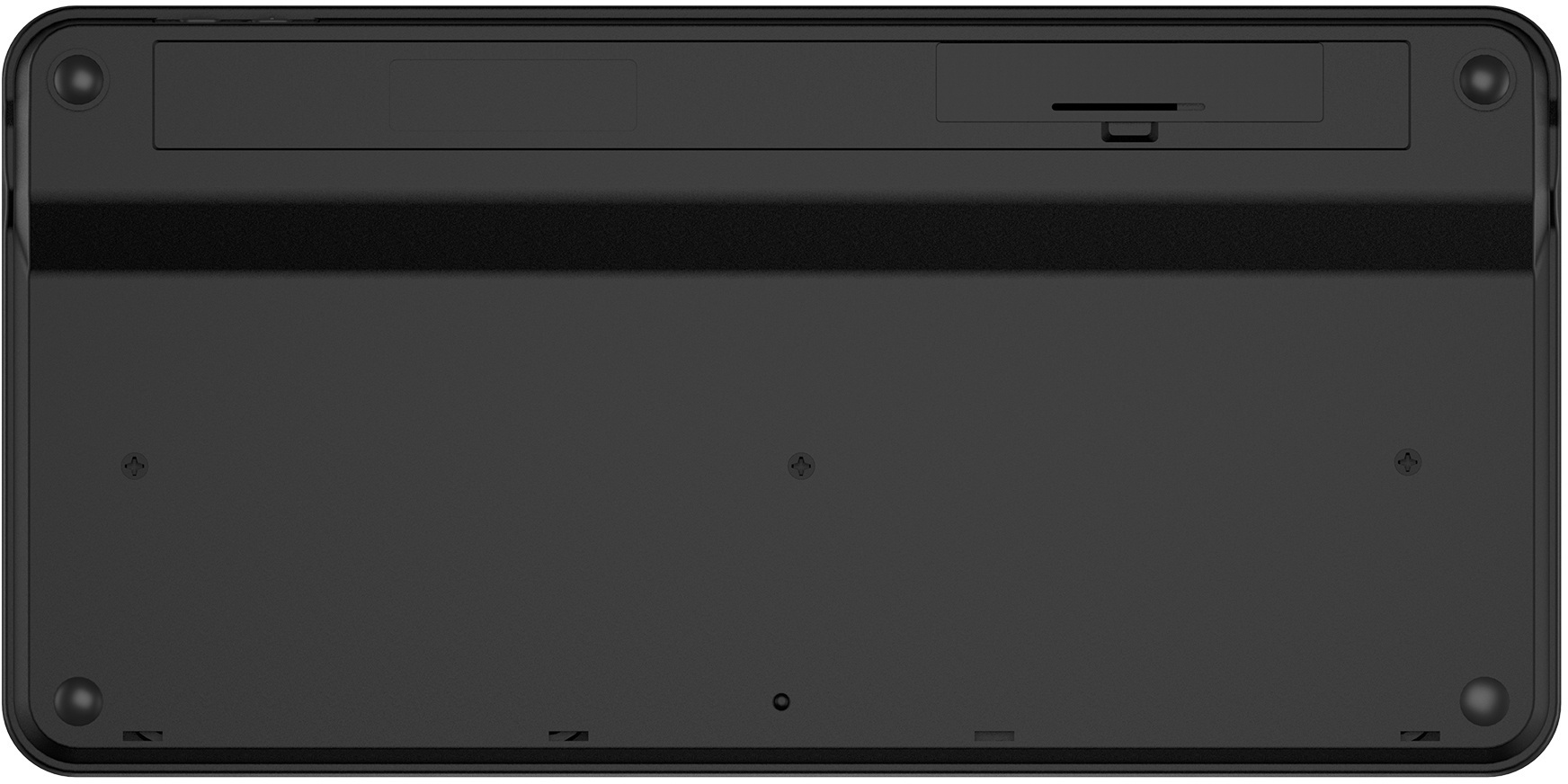 Та же модель, но в классическом чёрном. Всё ещё беспроводная, компактная, с низкопрофильными клавишами. Удобно в поездках, занимает минимум места. Дизайн лаконичный, корпус пластиковый, при печати не скрипит.