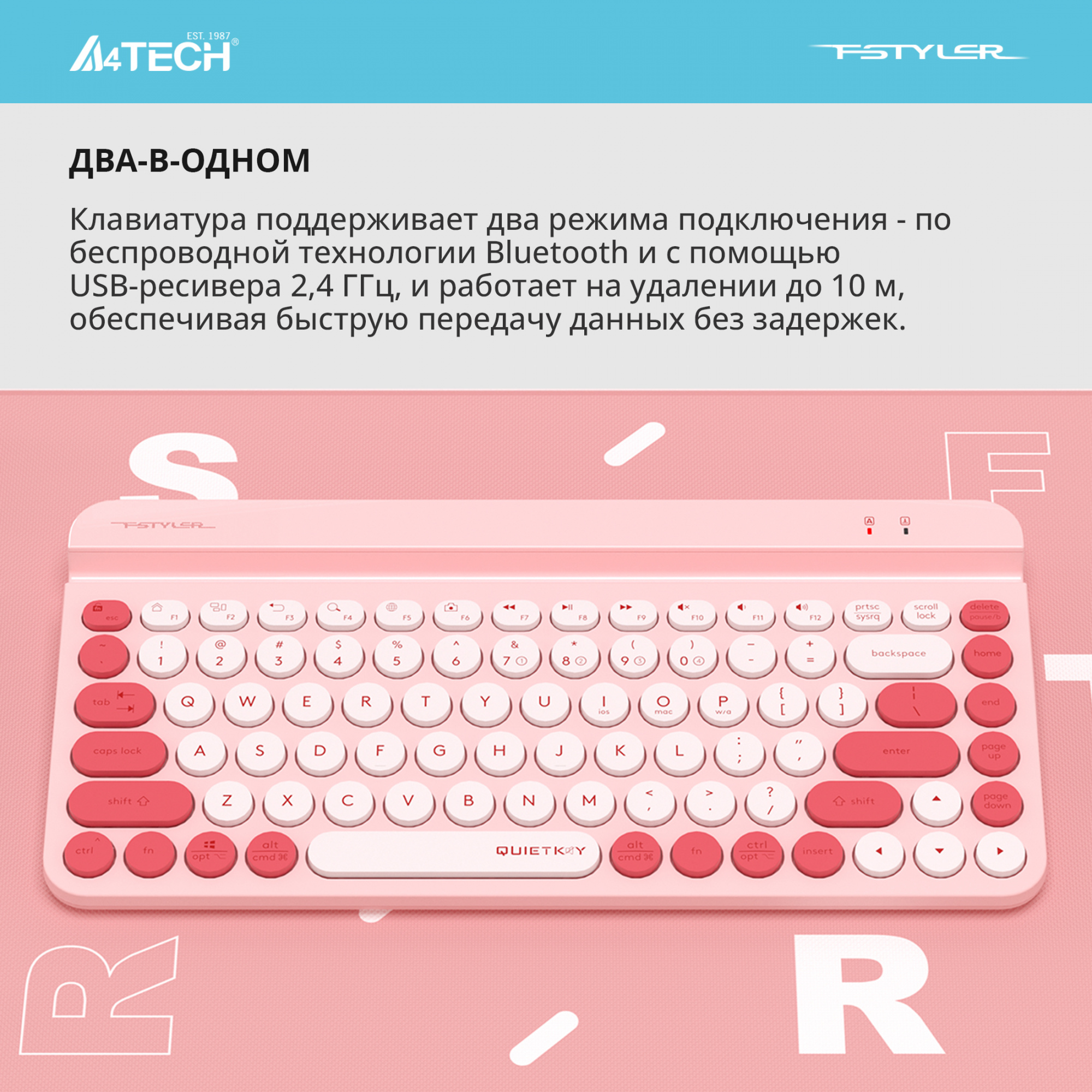 A4Tech Fstyler FBK30 RASPBERRY – беспроводная клавиатура для стиля и комфорта! Розовый цвет, мембранная конструкция, поддержка Bluetooth и радиоканала обеспечивают свободу использования. Подключение через USB делает ее универсальной. Идеальна для работы и творчества. Обновите рабочее место – покупайте FBK30 RASPBERRY уже сегодня!
