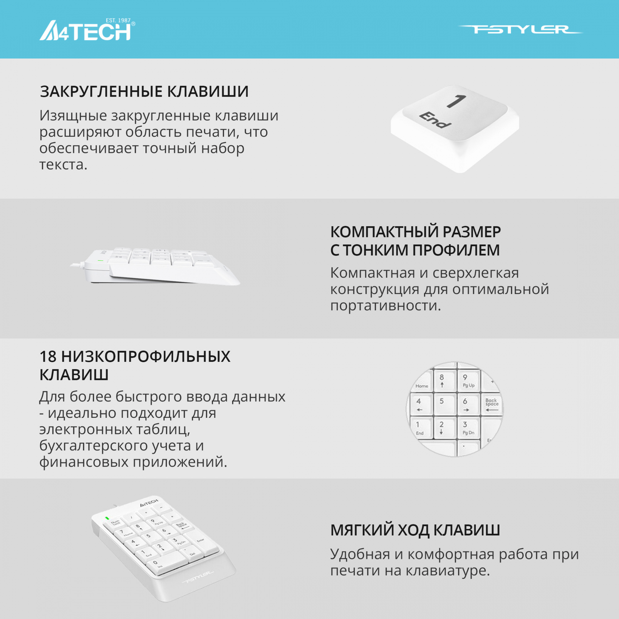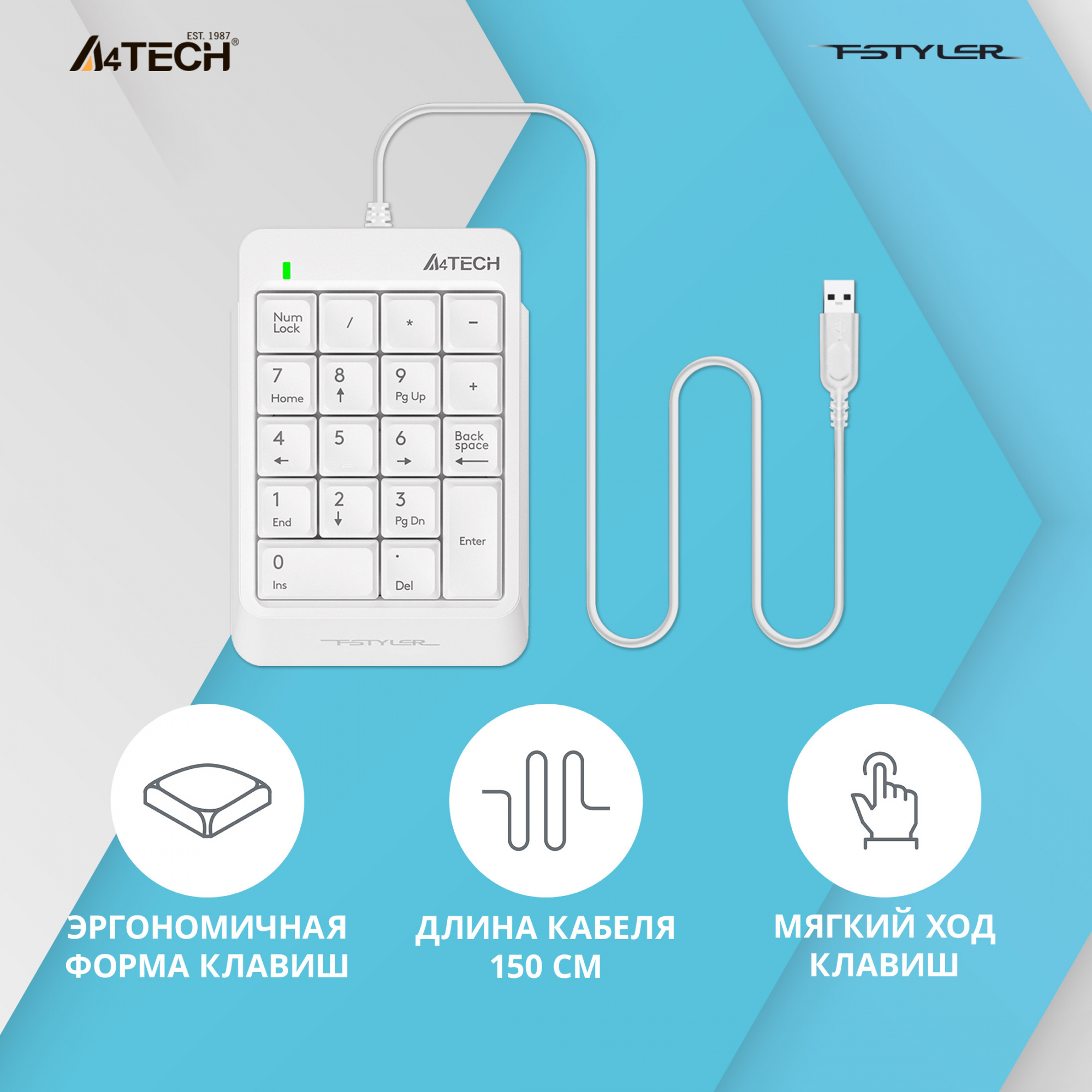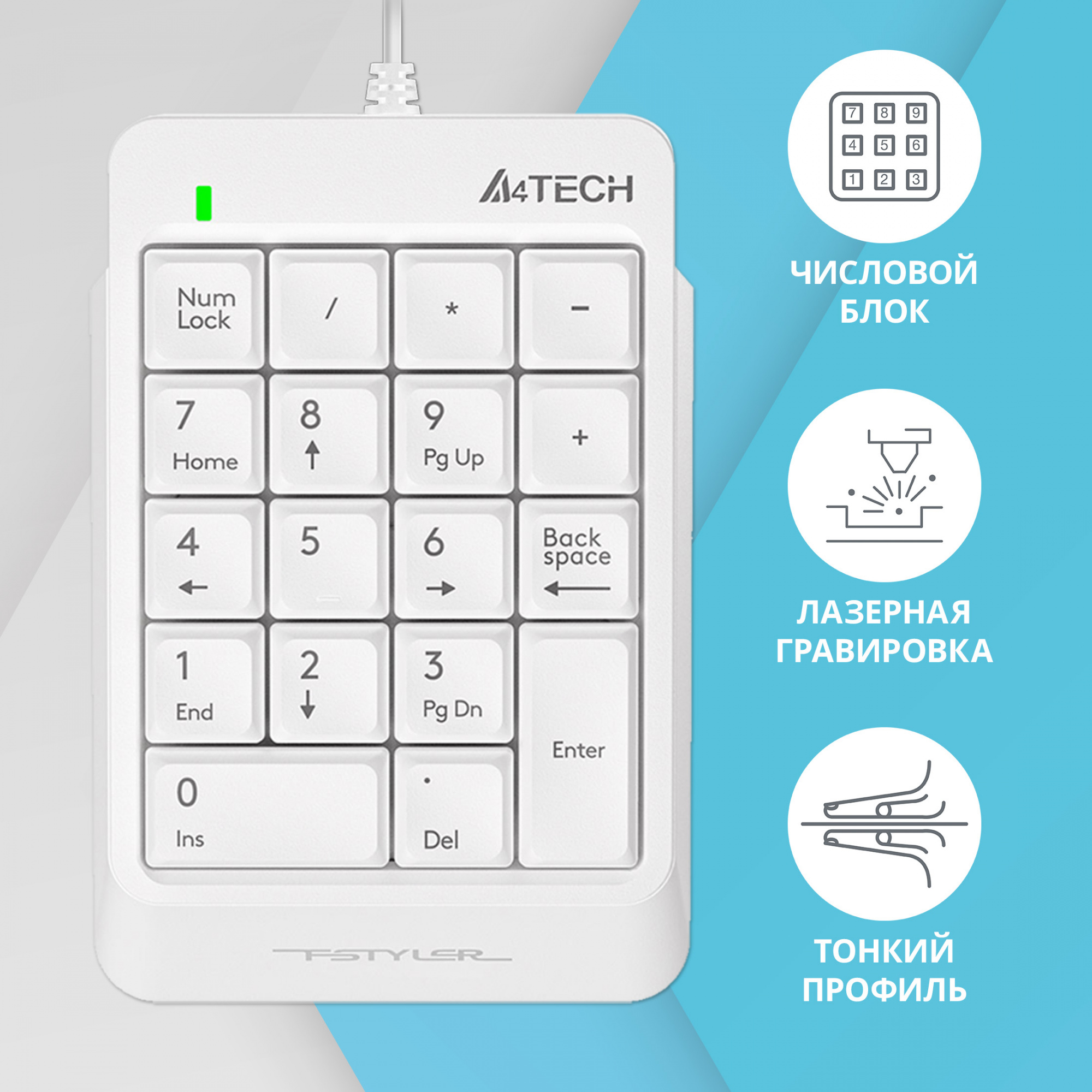 Клавиатура A4Tech - Fstyler FK13P, Проводная, USB, for mobilenum pad,waterproof, цвет белый, FK13P WHITE