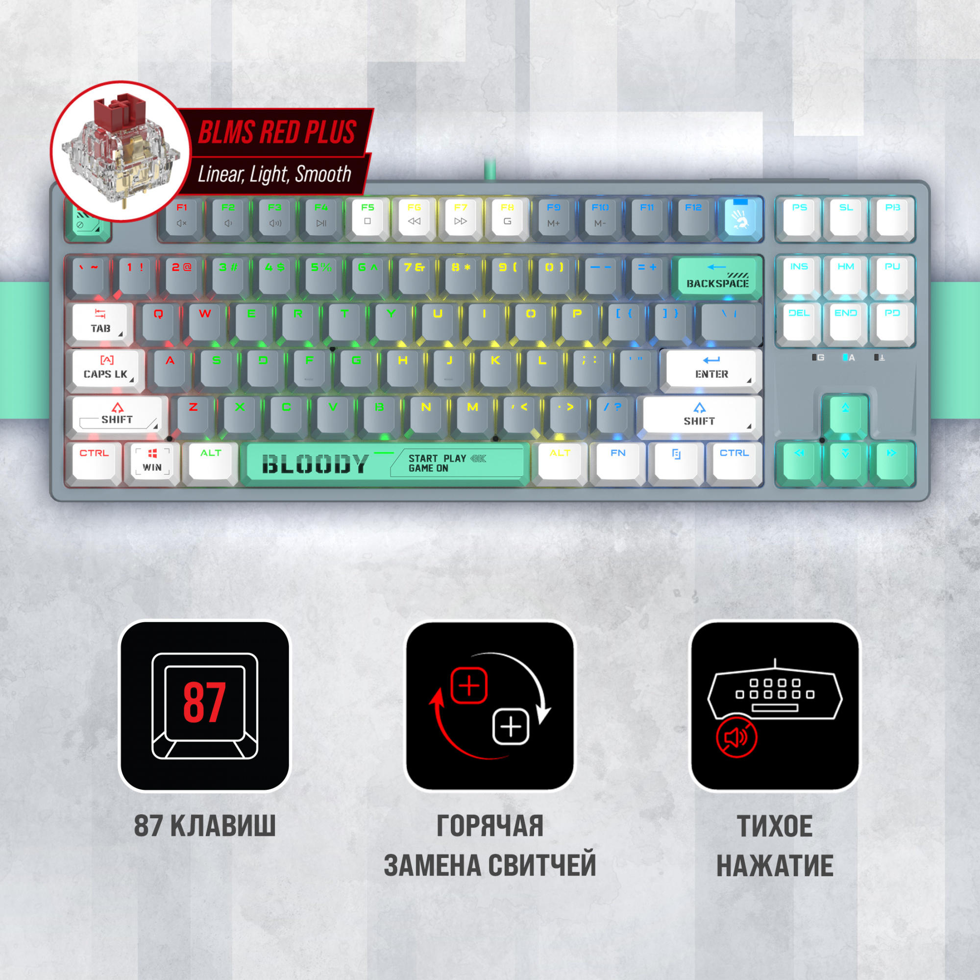 Клавиатура механическая A4Tech - Bloody S87 Energy, Проводная, USB, gaming, illumination keys, цвет серый, S87 USB ENERGY ASH