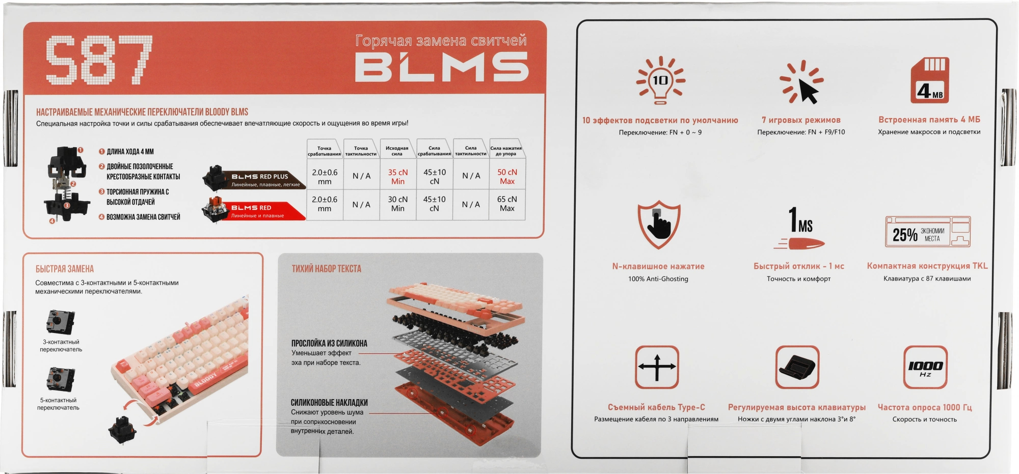 Клавиатура механическая A4Tech - Bloody S87 Energy, Проводная, USB, gaming, illumination keys, цвет розовый, S87 USB ENERGY PINK