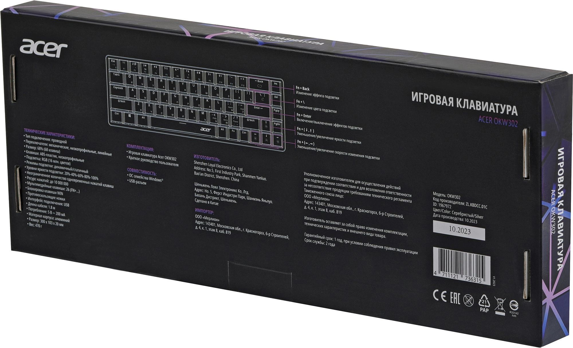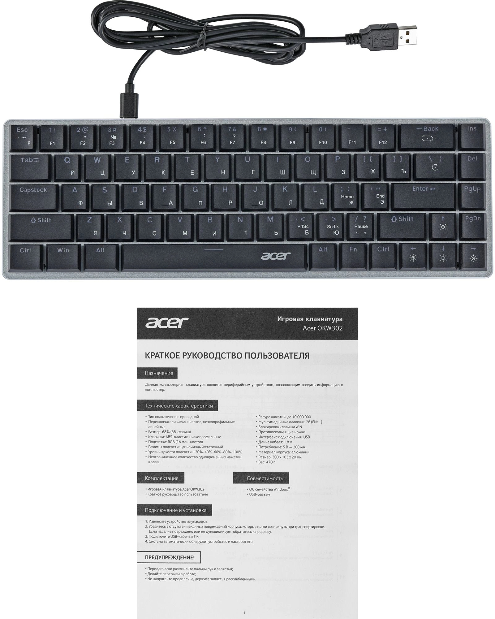 Клавиатура механическая Acer - OKW302, Проводная, USB, gaming, illumination keys, цвет серебристый, ZL.KBDCC.01C