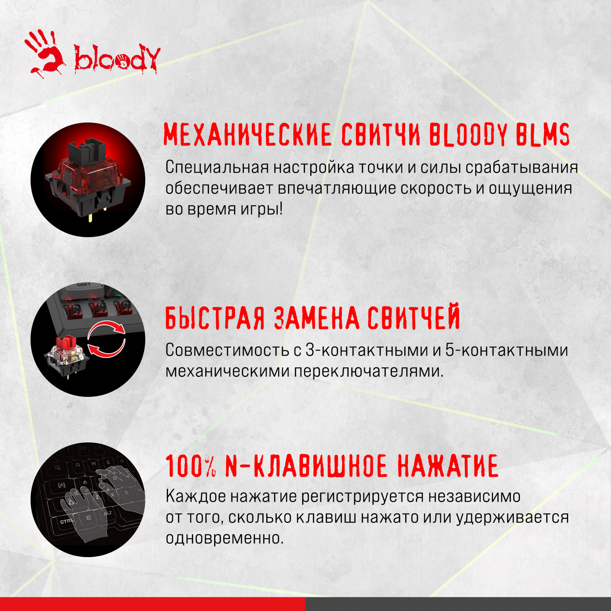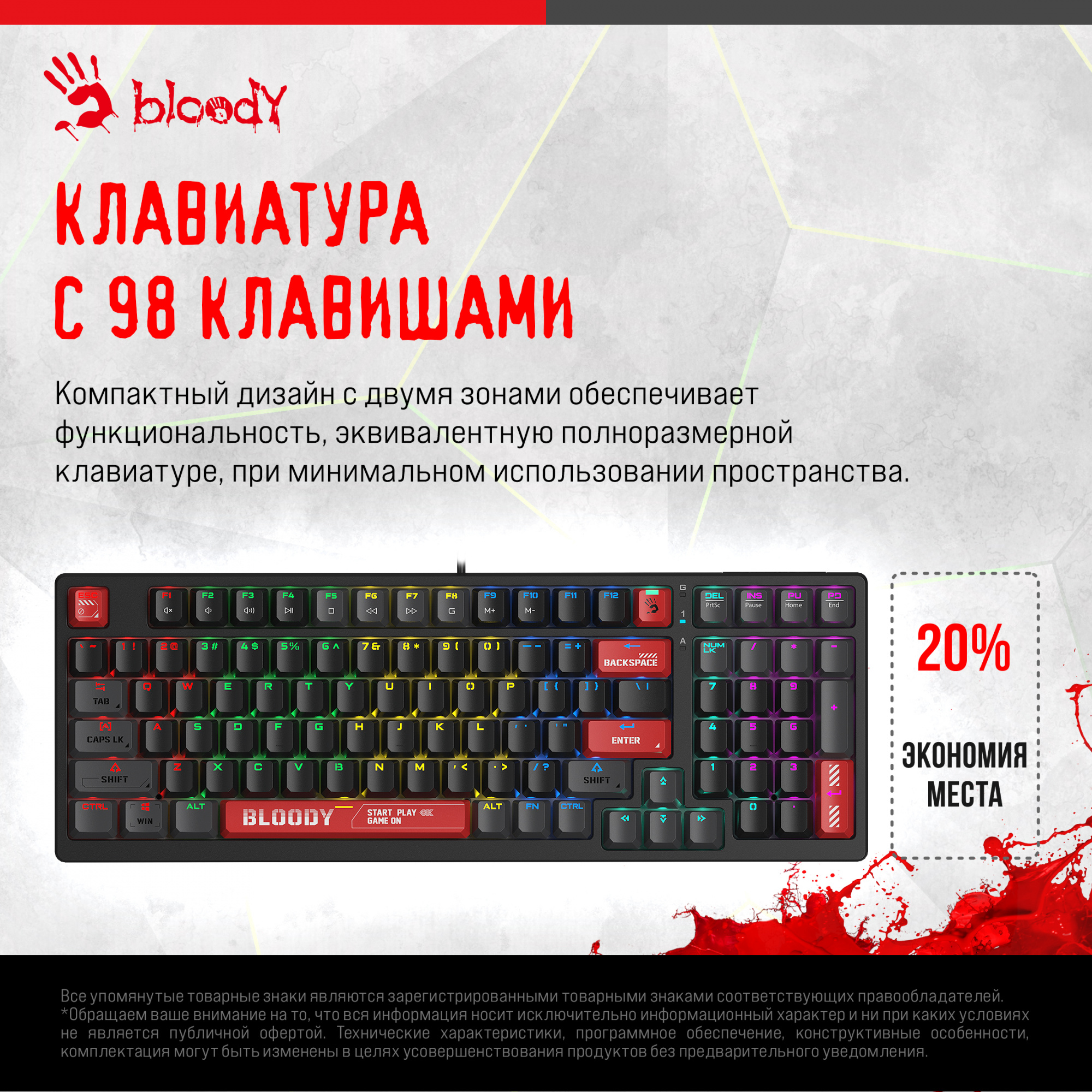 Клавиатура механическая A4Tech - Bloody S98, Проводная, USB, gaming, illumination keysnum pad,waterproof, цвет чёрный, S98 RED