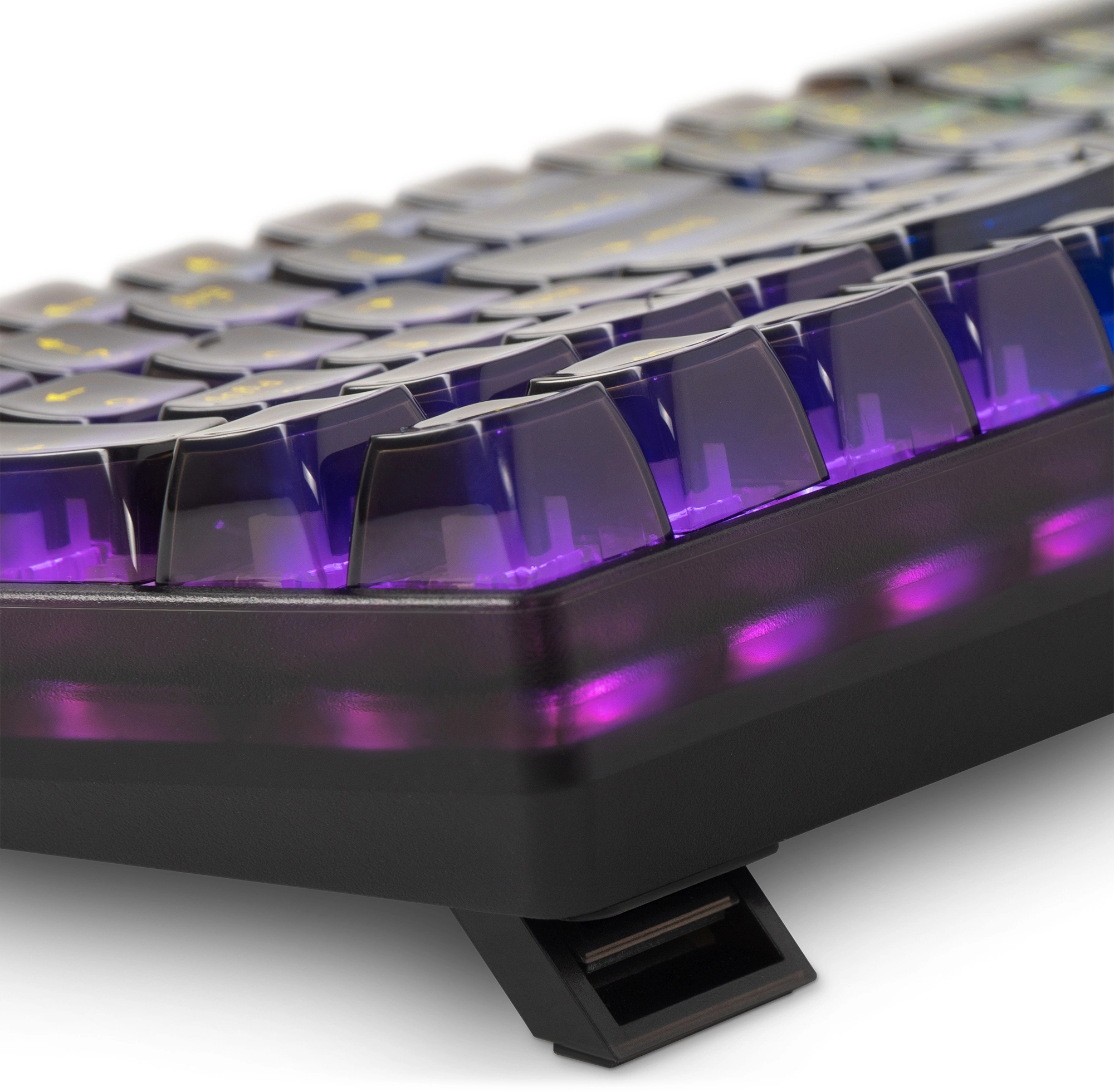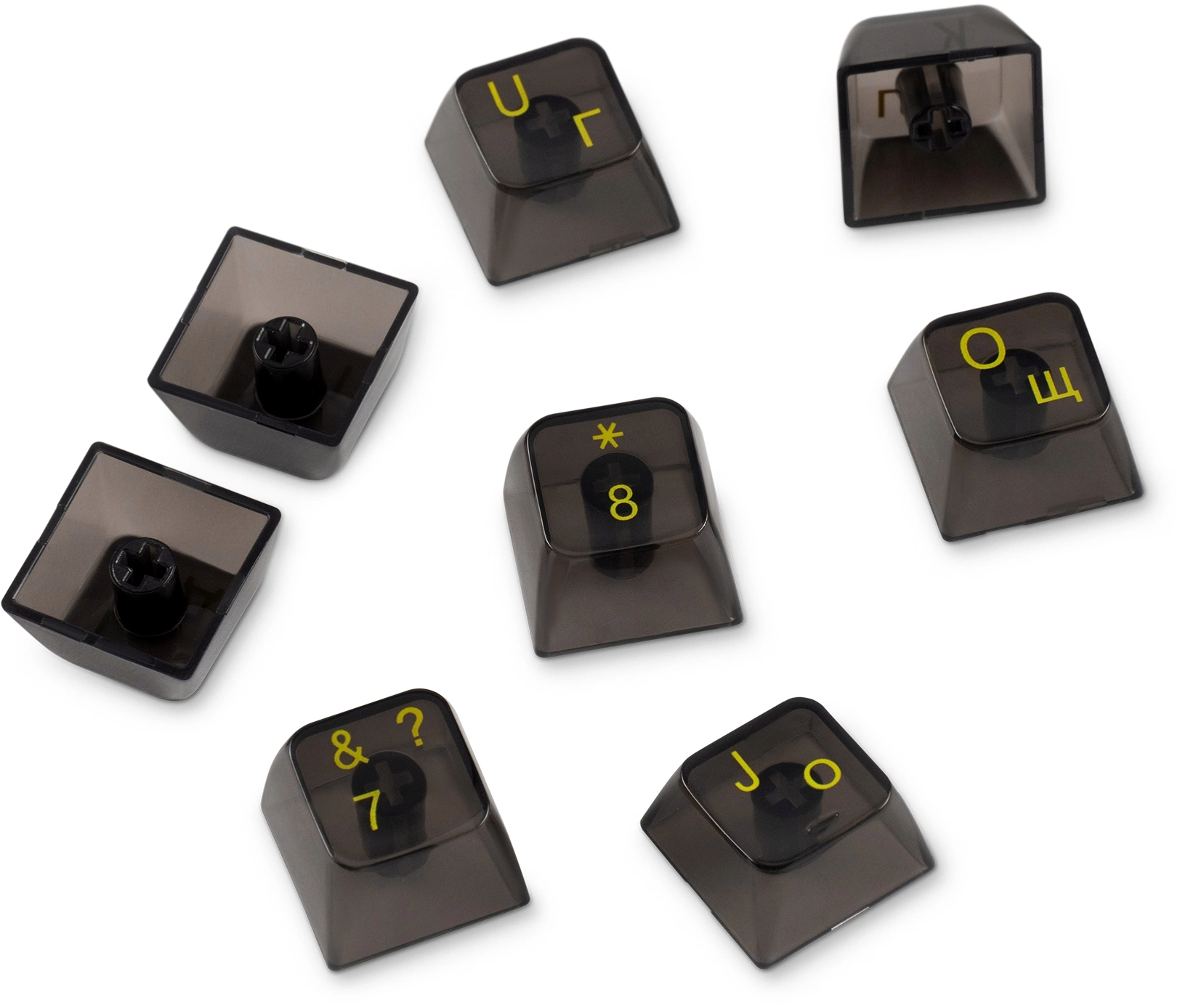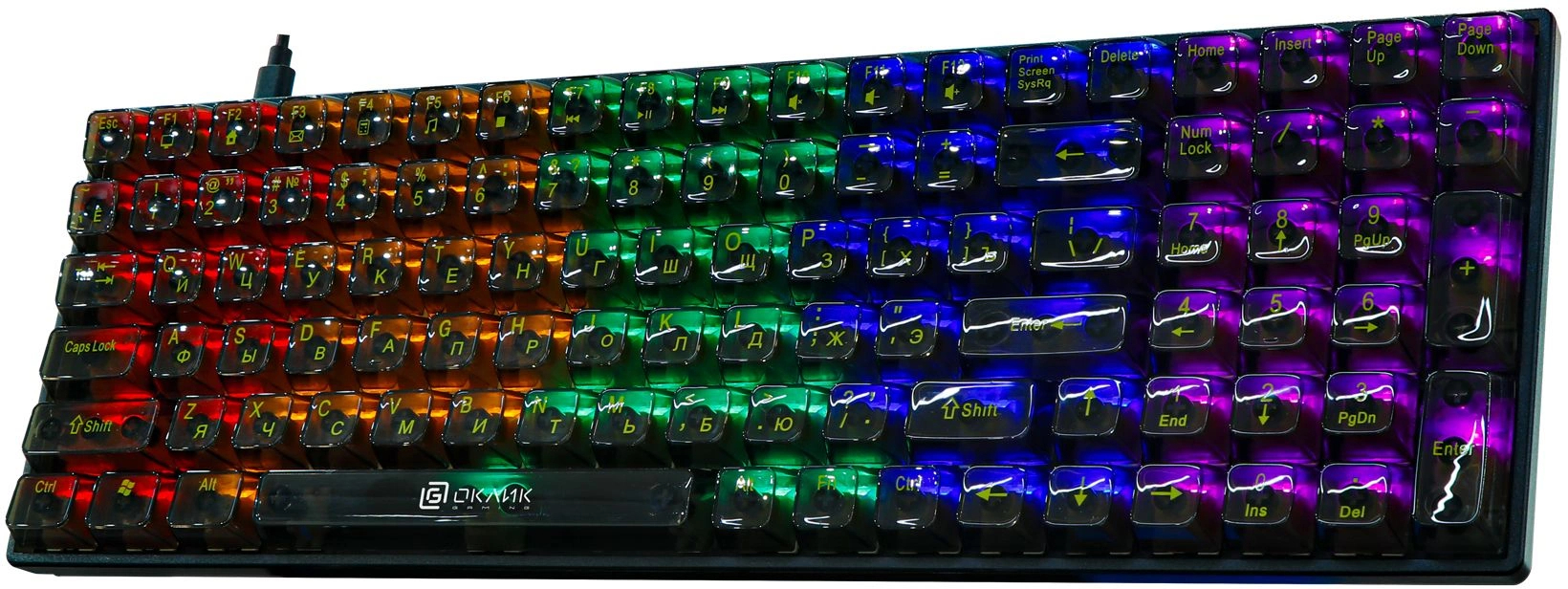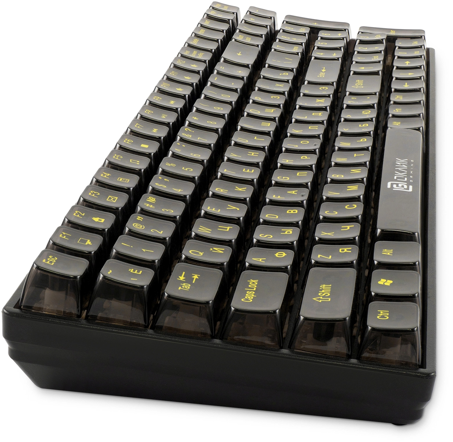 Механические переключатели в классическом форм-факторе, чёрный цвет, возможно подсветка. Провод USB в оплётке, чёткое нажатие, громкость средняя.