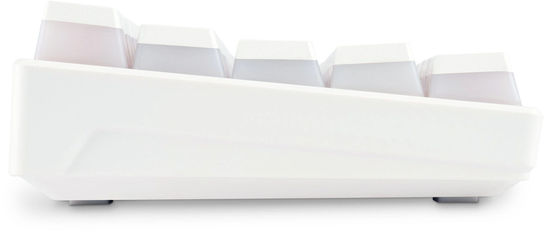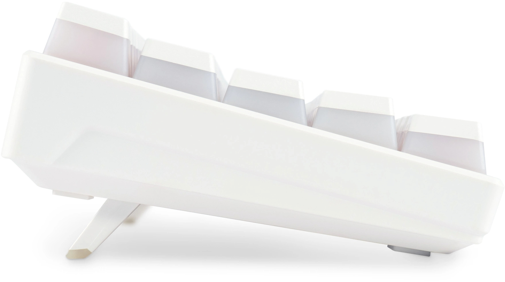 Компактный форм-фактор с механическими переключателями, беспроводное подключение — освобождает стол от проводов. Белый корпус выглядит утончённо.