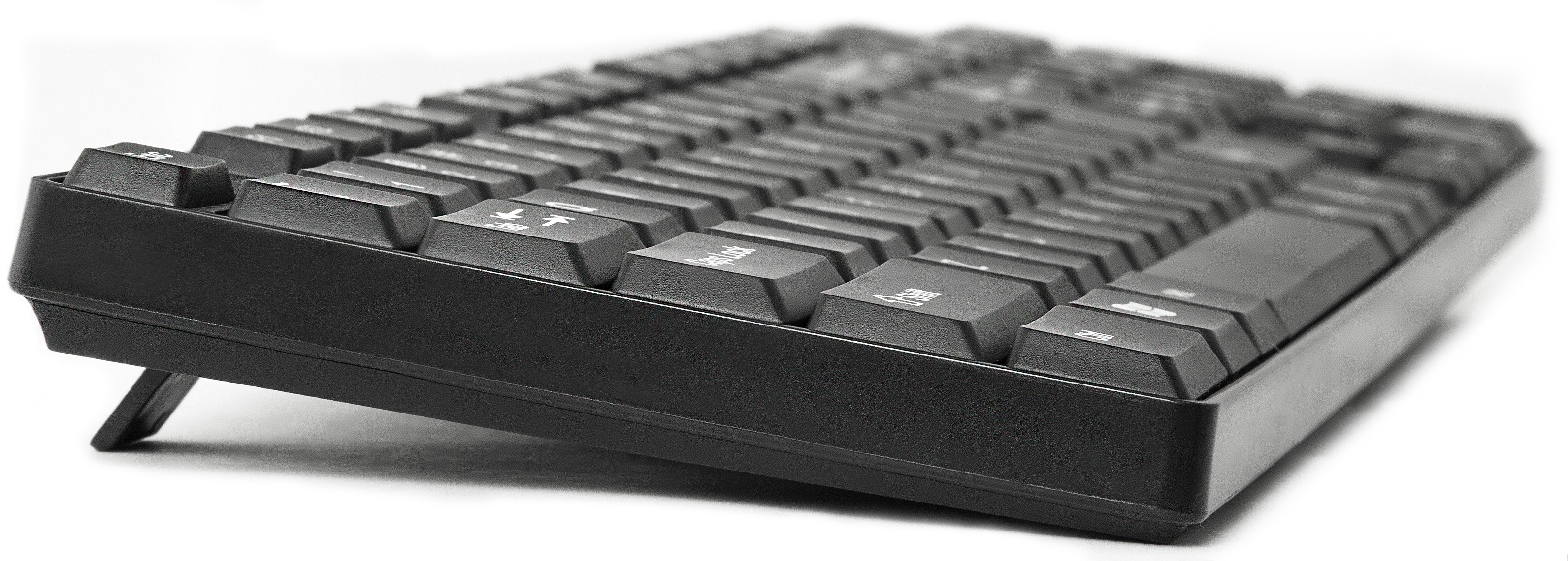 Проводная мембранная модель с аккуратным оформлением. Кнопки плоские, напоминают ноутбучные, набирать тексты легко. Нет громких щелчков, соседям по офису комфортно. Корпус из матового пластика, панель ровная, клавиши красиво прилегают.