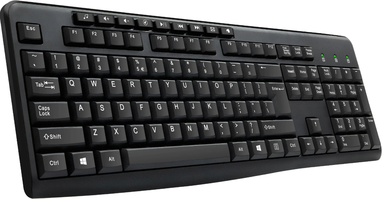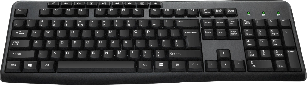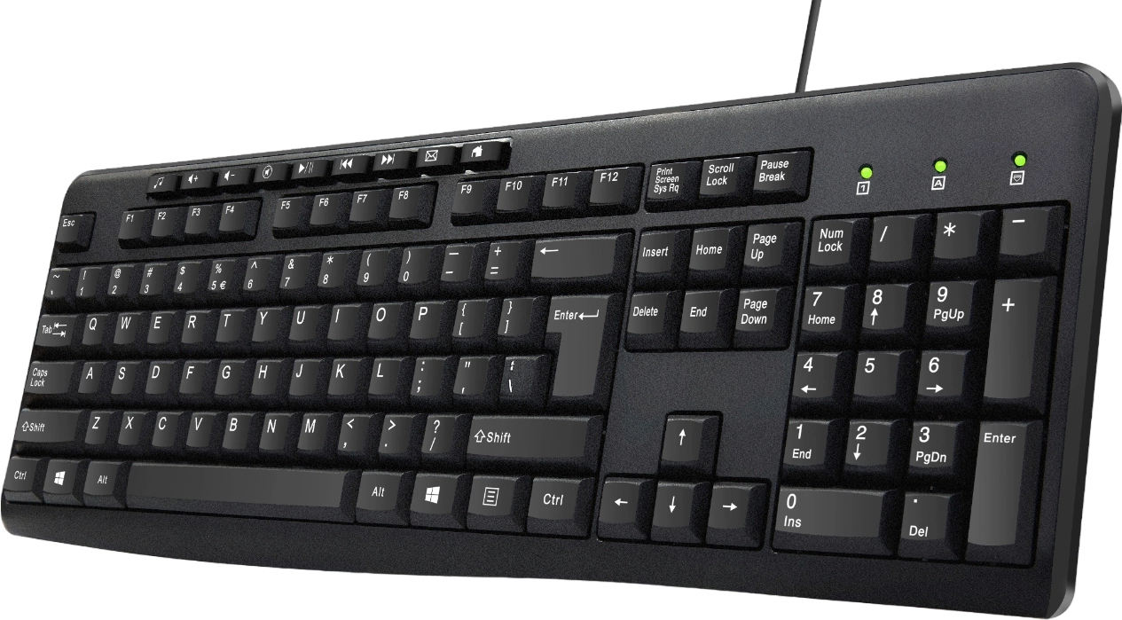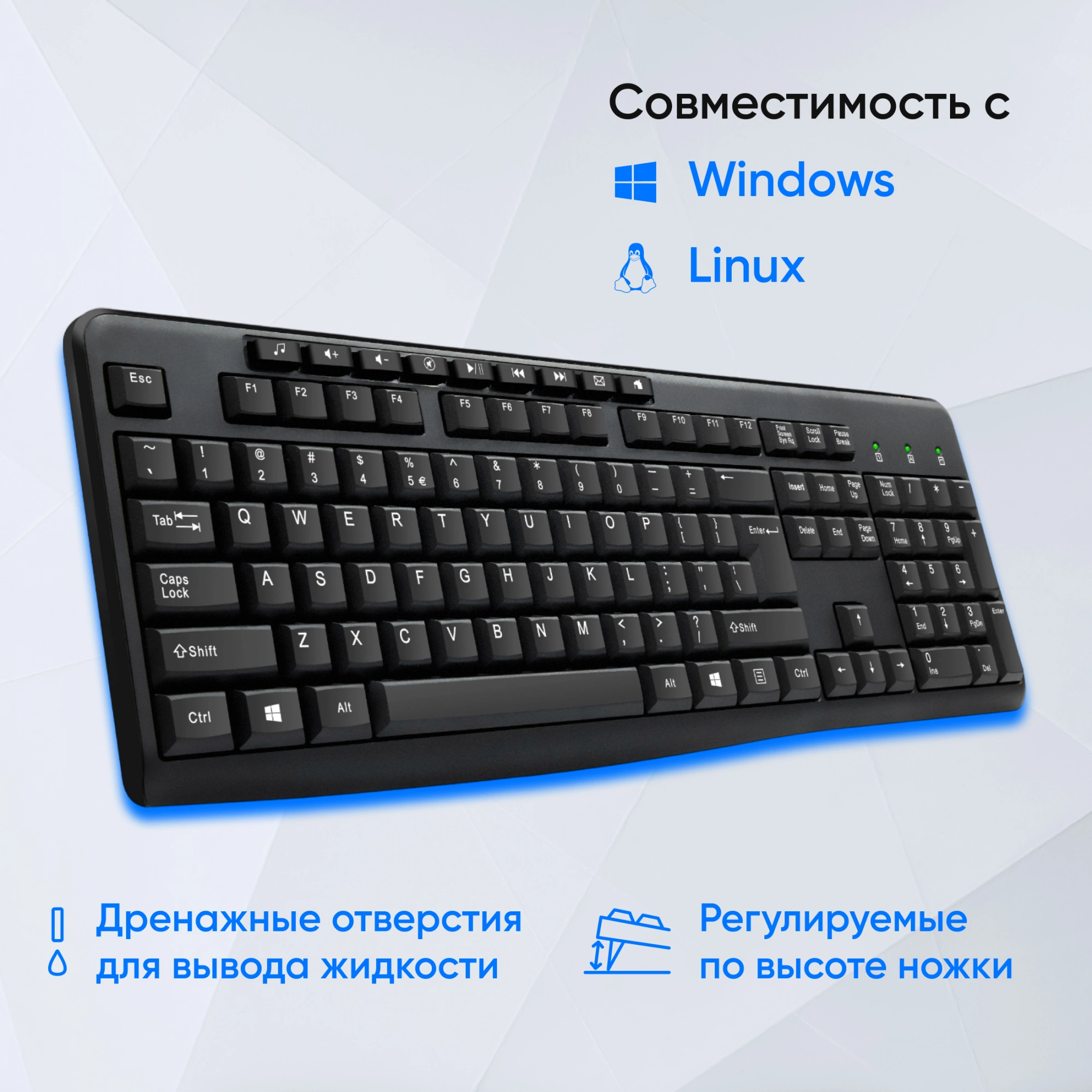 Бюджетная мембранная клавиатура, у которой лёгкий ход клавиш и прочный пластик корпуса. Проводное подключение USB, шрифт яркий. Нет ни подсветки, ни особых медиакнопок — только стандарт. Зато надёжна, не боится мелких ударов.