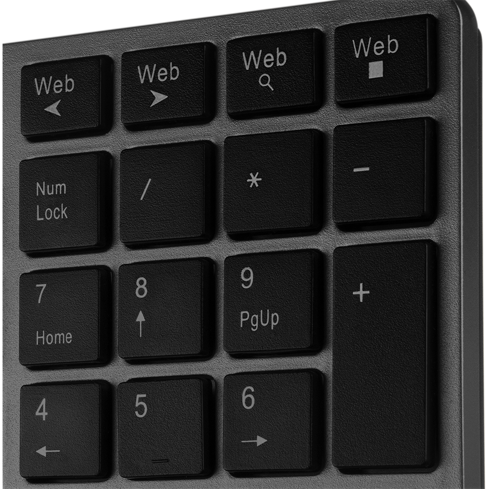 Универсальный формат с низкими клавишами, мембранный принцип, бесшумная печать. Проводное подключение USB, классический набор кнопок, включая NumPad.