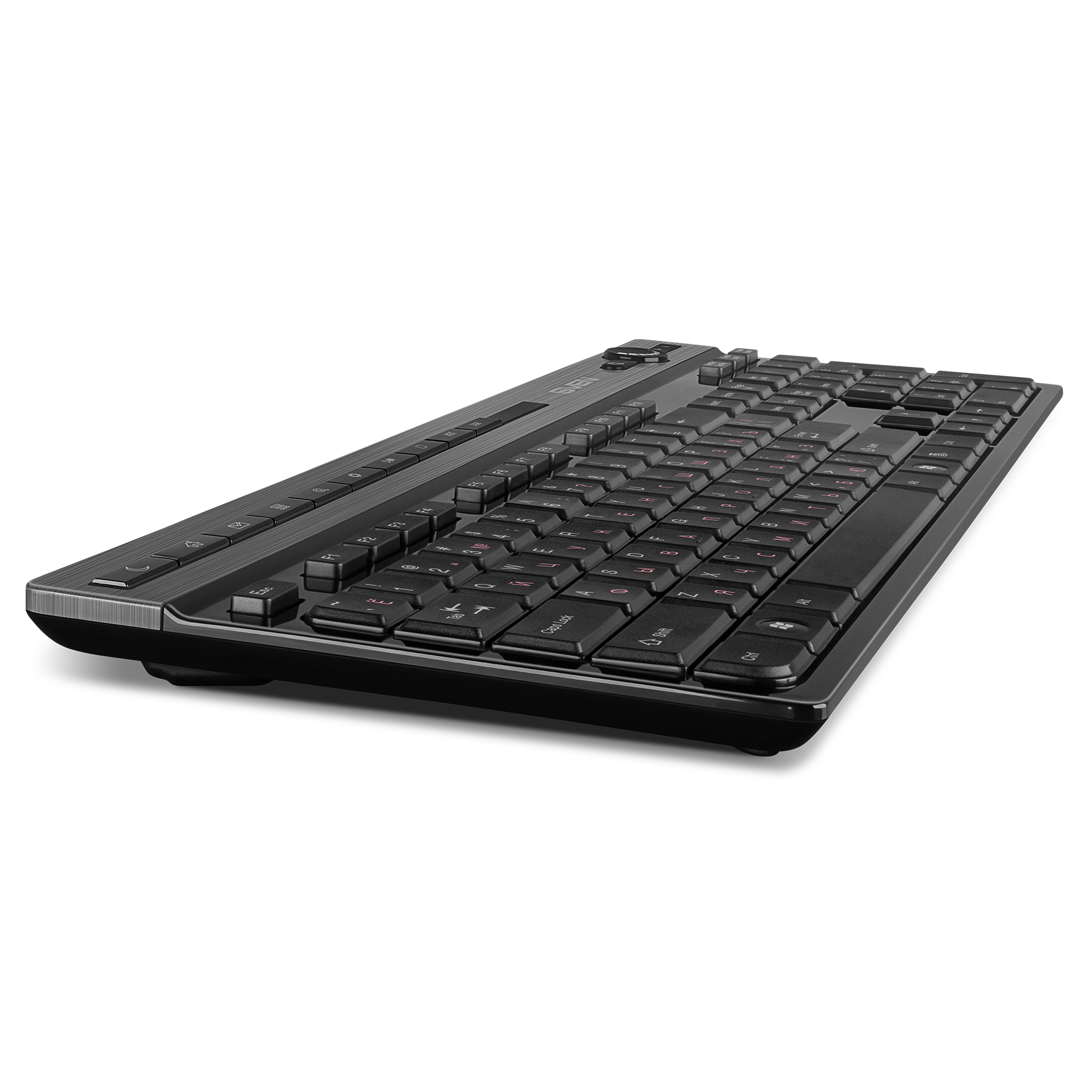 Тонкий корпус, беспроводной интерфейс 2,4 ГГц, мембранная структура — набор мягкий. Полноразмерный формат с NumPad. Батарейки надолго хватит.