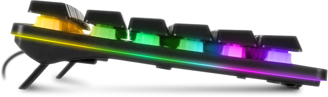 Модель отлично подойдёт для любителей игр и текстового набора: система подсветки выделяет основные клавиши, упрощая работу в тёмном помещении. Сами клавиши нажимаются мягко, без громкого щёлка. Корпус смотрится строго, а боковые вставки придают изюминку.