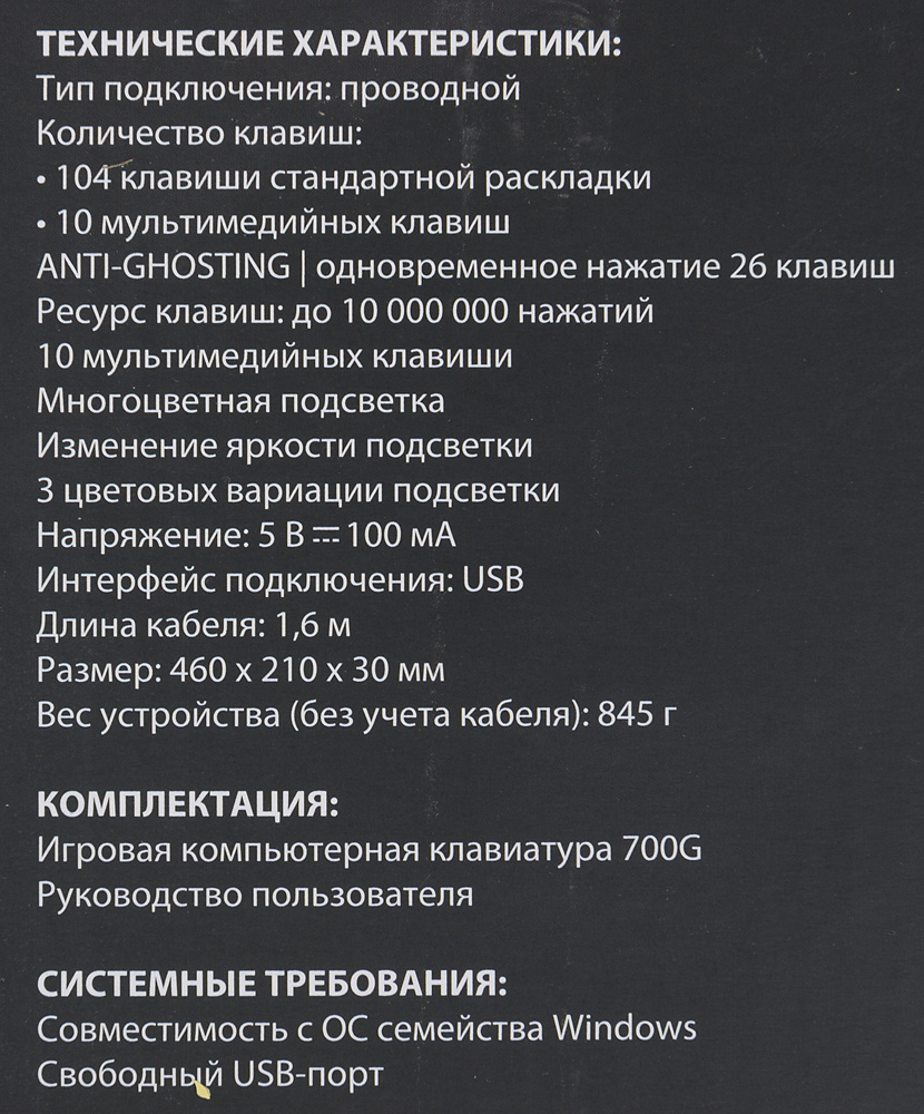 Игровое оформление, мембранные клавиши с подсветкой. Провод USB, дизайн «под металл», стойкий к потертостям. Предусмотрены мультимедийные клавиши.