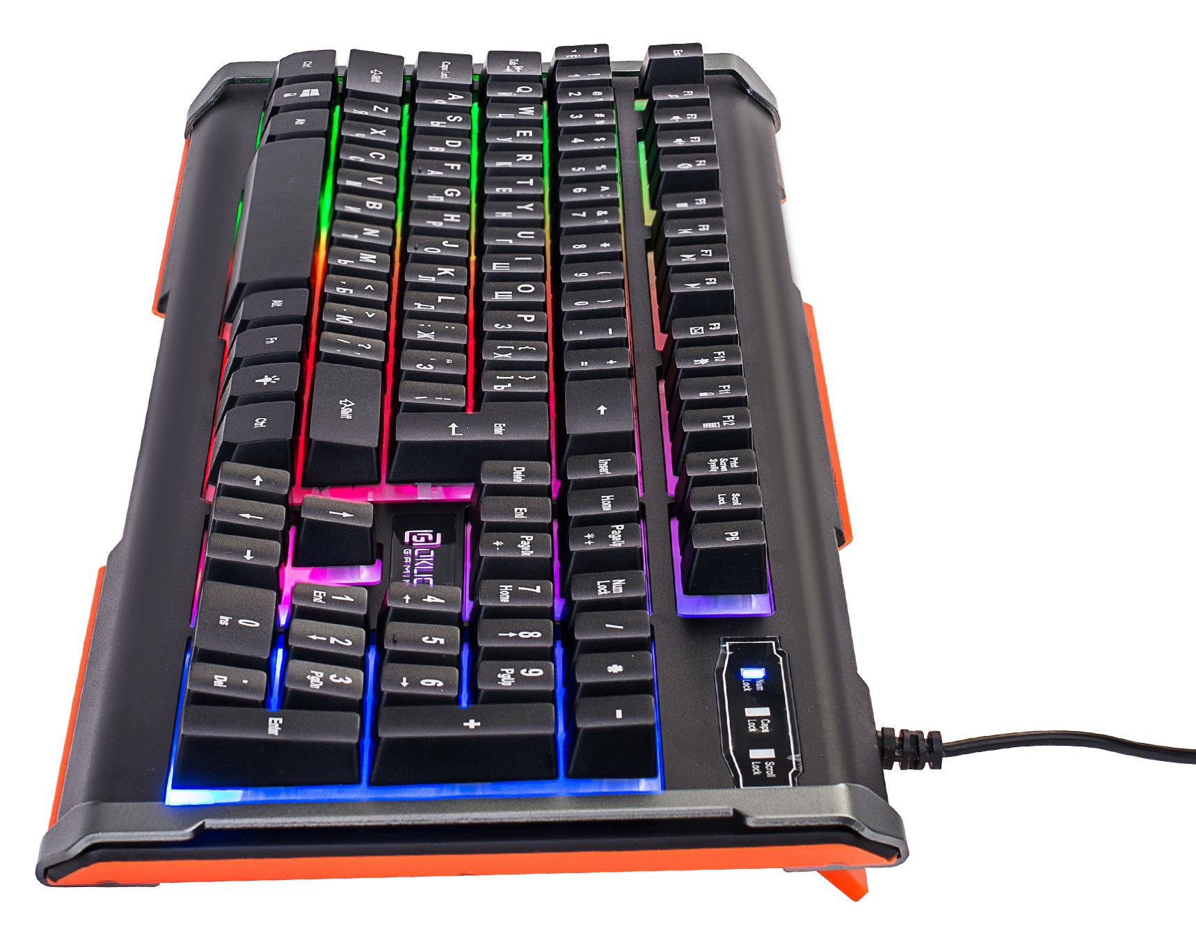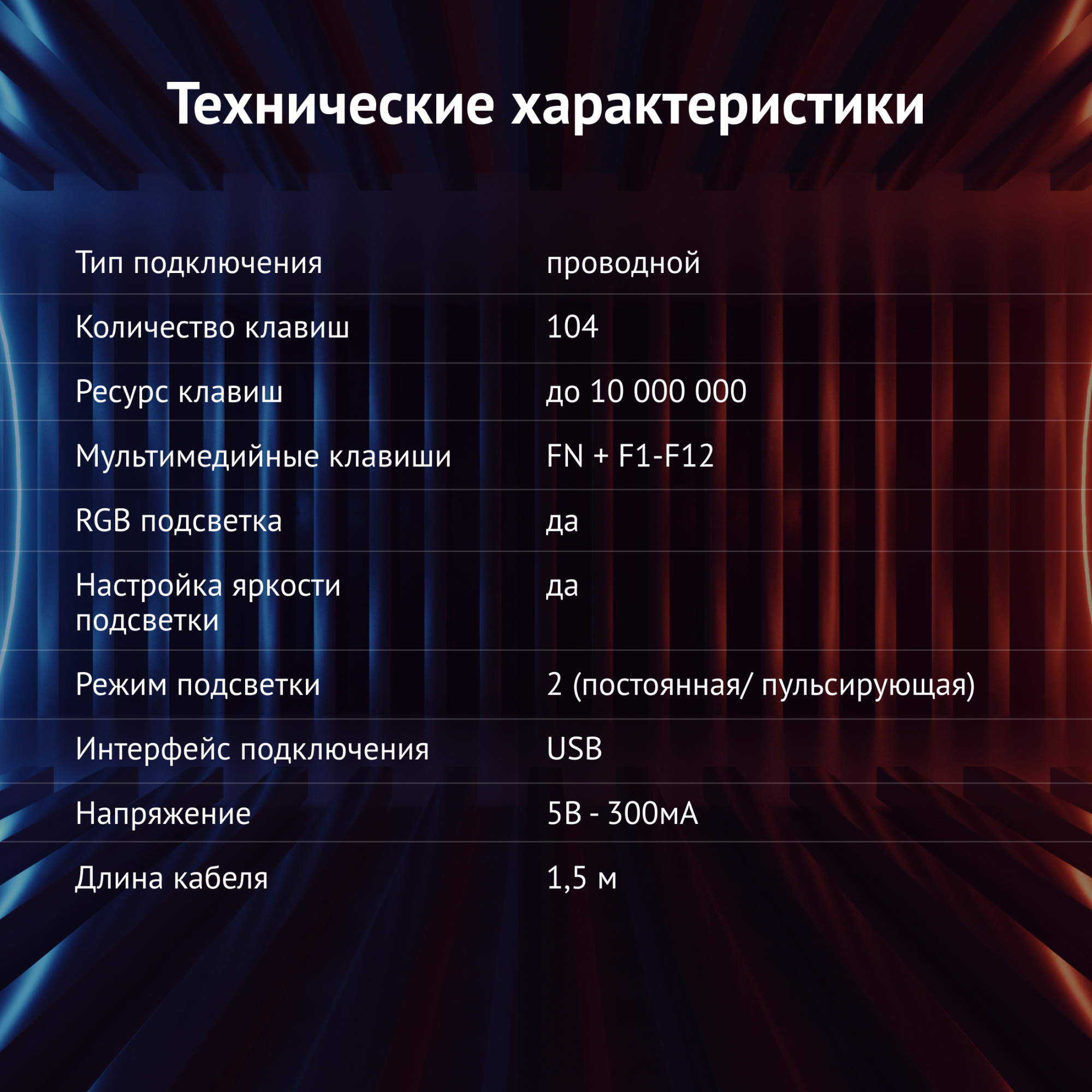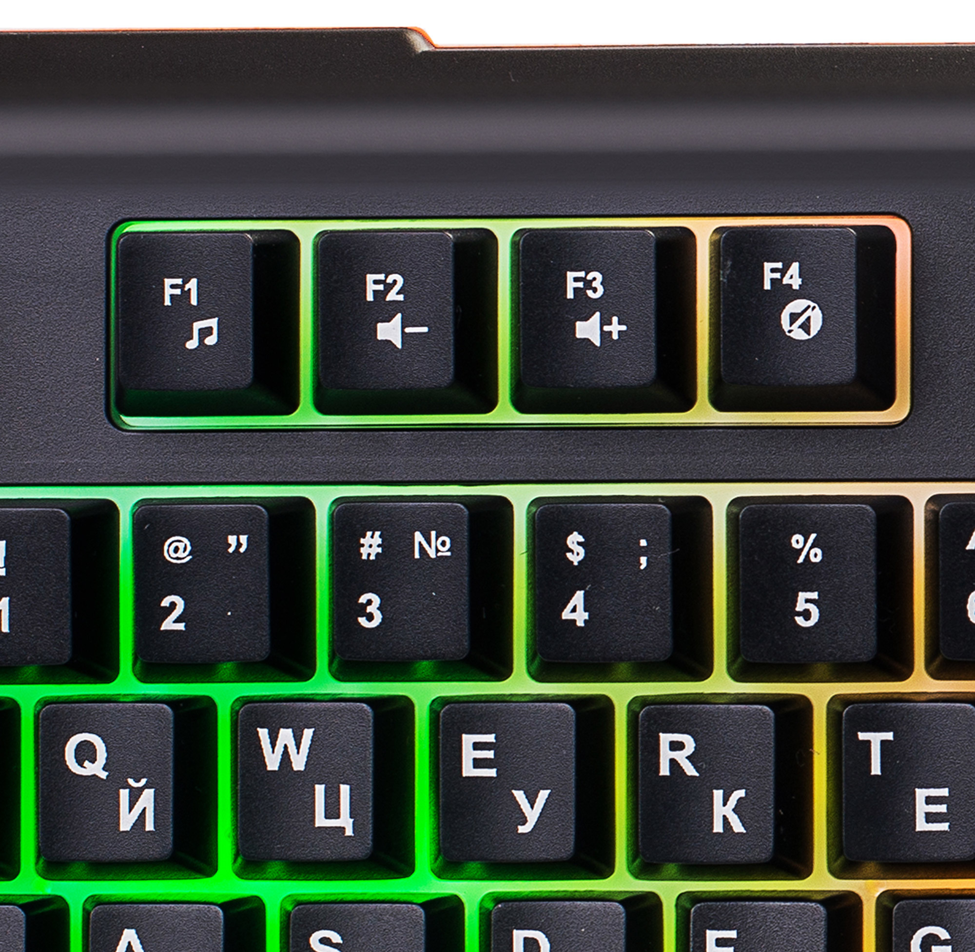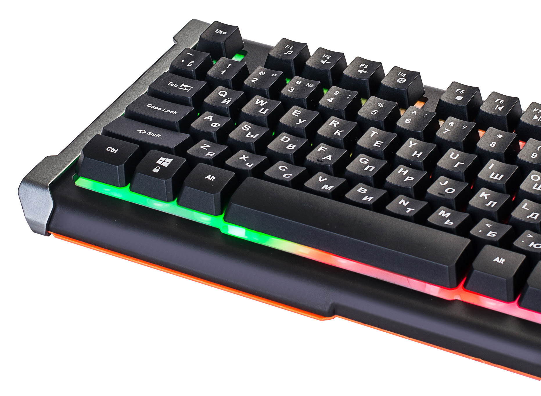 Мембранная модель в геймерском стиле, подсветка разноцветная, функциональные клавиши упрощают управление мультимедиа. Матовый пластик, кабель USB.