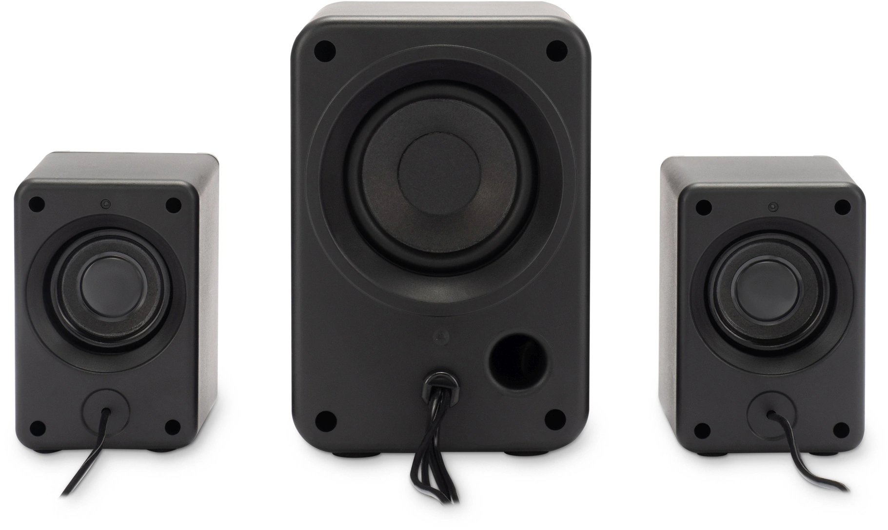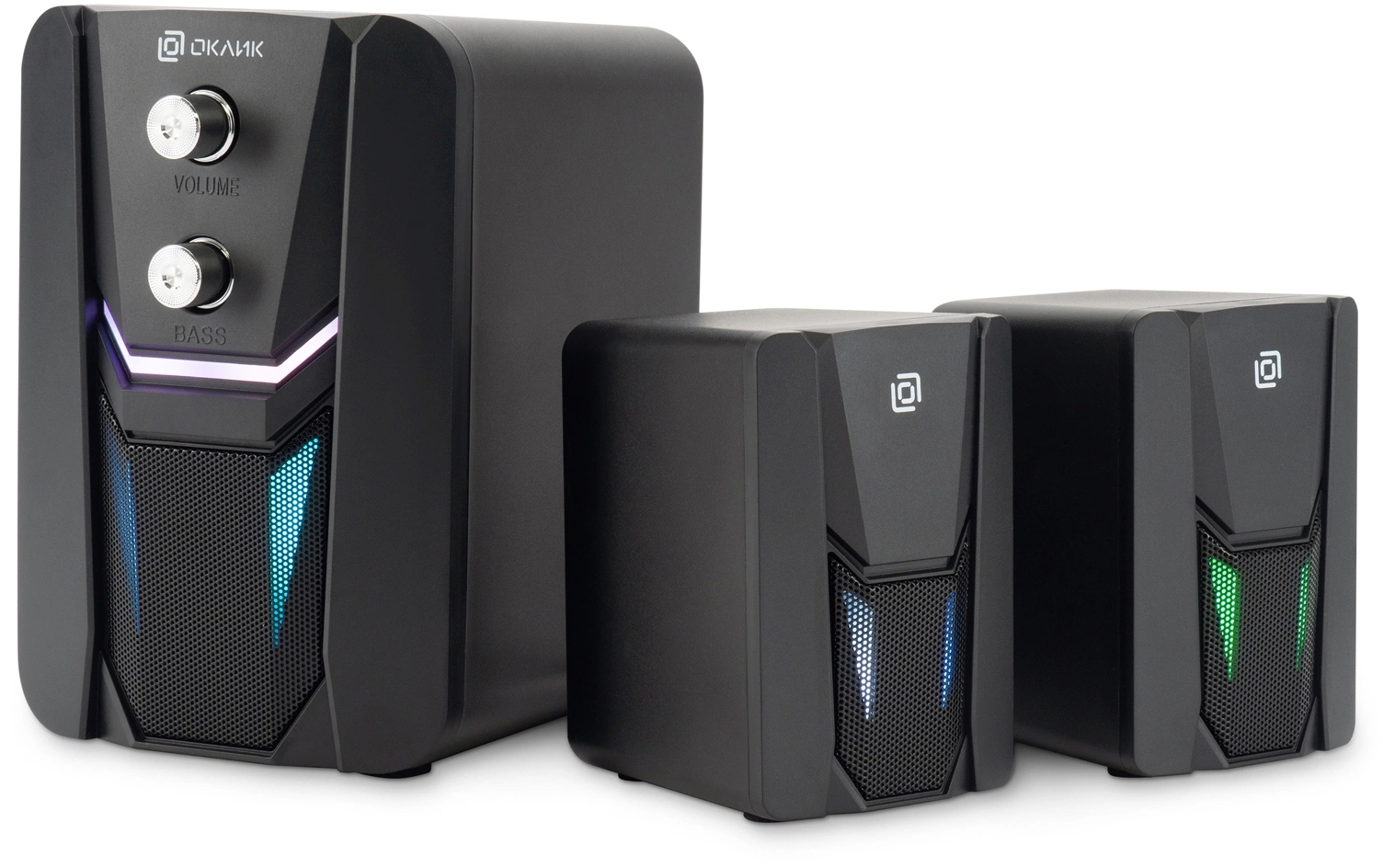 Похожий набор: сабвуфер и две маленькие колонки. Проводное управление громкостью, звук более богат в низких частотах по сравнению с 2.0. Для музыки и игрового процесса пригодно.