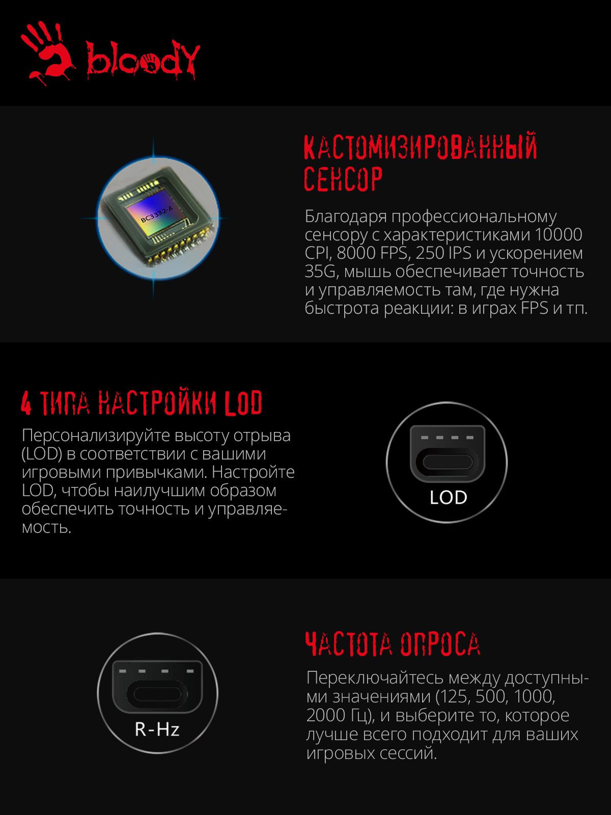 Красный корпус с матовой поверхностью. Провод длиной 1.8 м. Сенсор 20000 DPI. RGB-подсветка с синхронизацией.