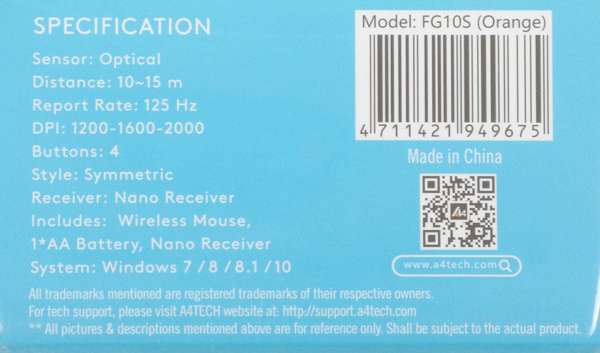 Мышь A4Tech - FG10S, Беспроводная, Optical, 2000 dpi, 4 btns, цвет чёрный, FG10S ORANGE