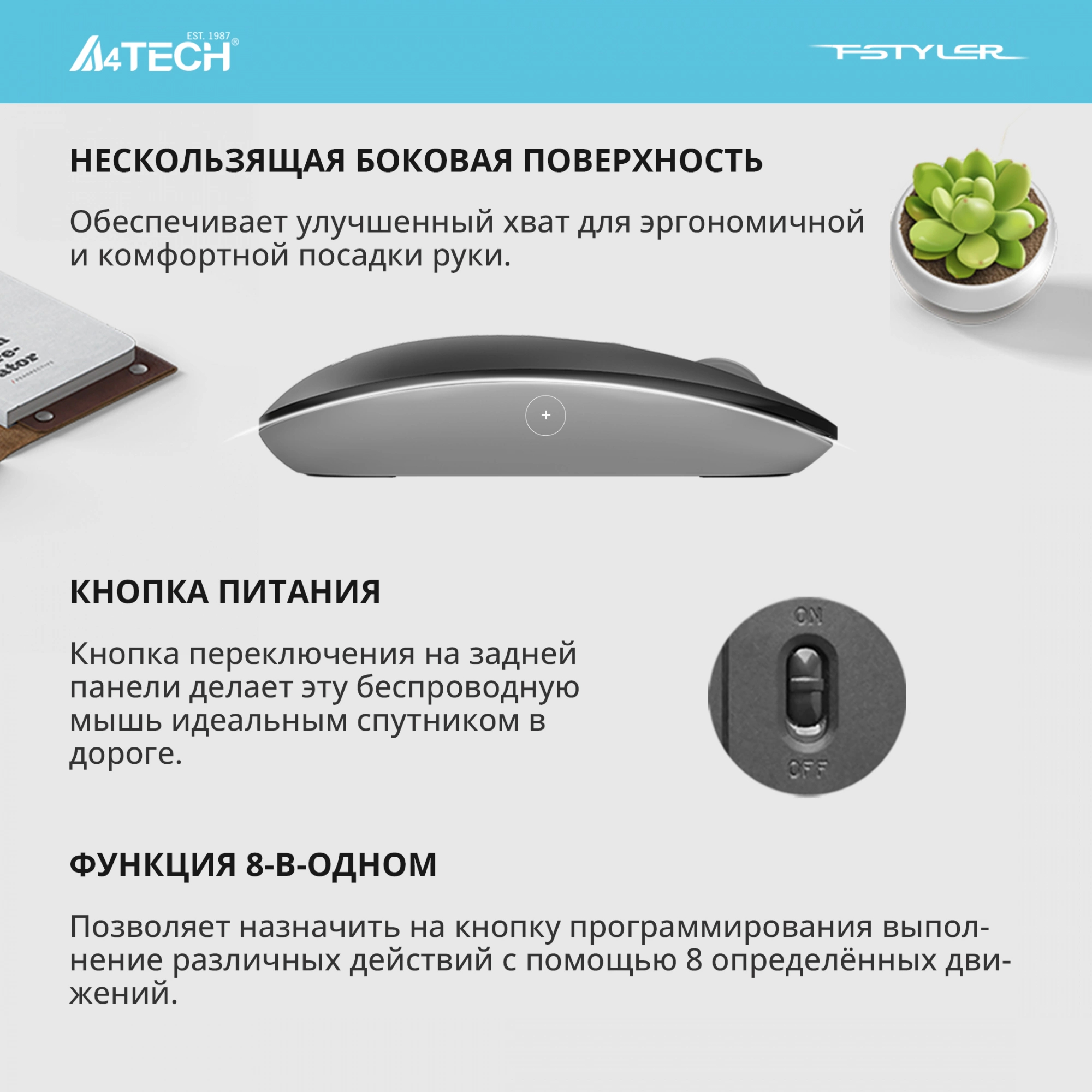 Хорошо лежит в руке, колёсико крутится с чёткими отсечками. Автоматически отключается, если долго не трогать. Питание одной AA-батарейкой, хватает месяца на два-три. Отличная повседневная мышь, довольна.