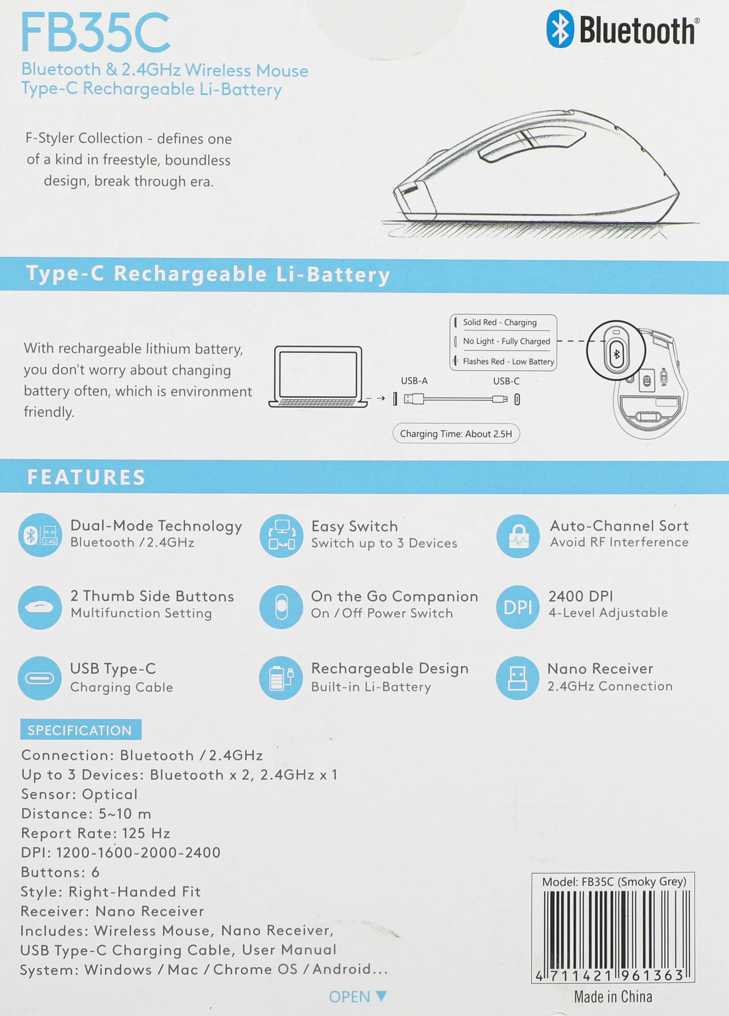Мышь A4Tech - Fstyler FB35C, Беспроводная, Optical, 6 btns, цвет серый, FB35C SMOKY GREY