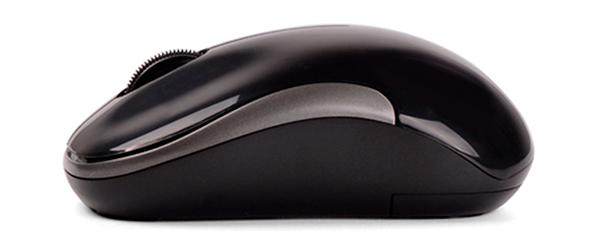 Беспроводная оптическая мышь, классическая чёрная. Приёмник 2,4 ГГц, дальность до 10 м. Кнопки тихие, форма симметричная, подойдёт левше. Питание от одной батарейки AA, обещает долго работать. Прекрасно для ноутбука в дороге.