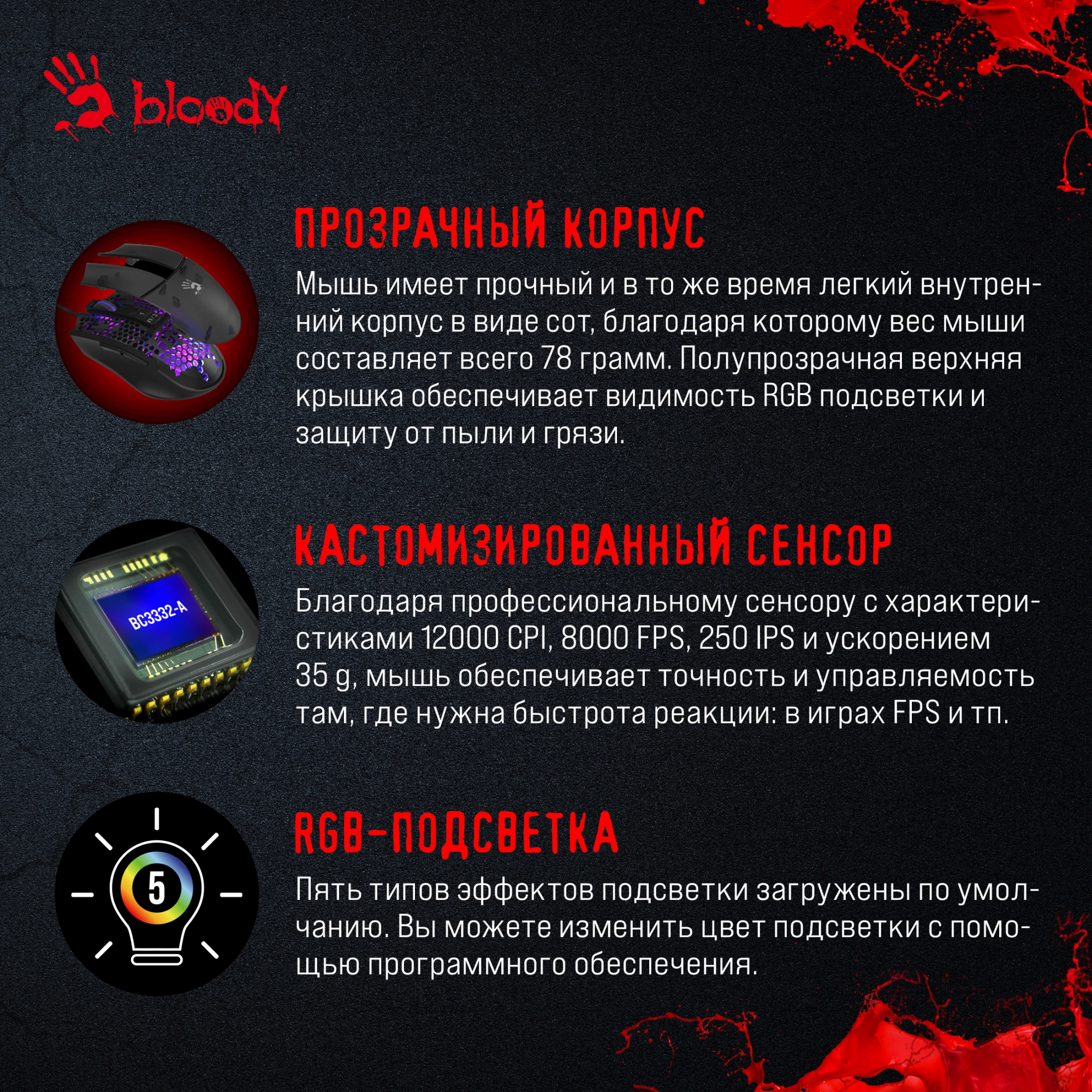 Лёгкий игровой манипулятор с перфорированным корпусом, что улучшает вентиляцию и снижает вес. Проводная архитектура гарантирует моментальный отклик, сенсор не срывается при быстрых рывках. Форма удобно лежит в руке, для длительных сессий это важно.