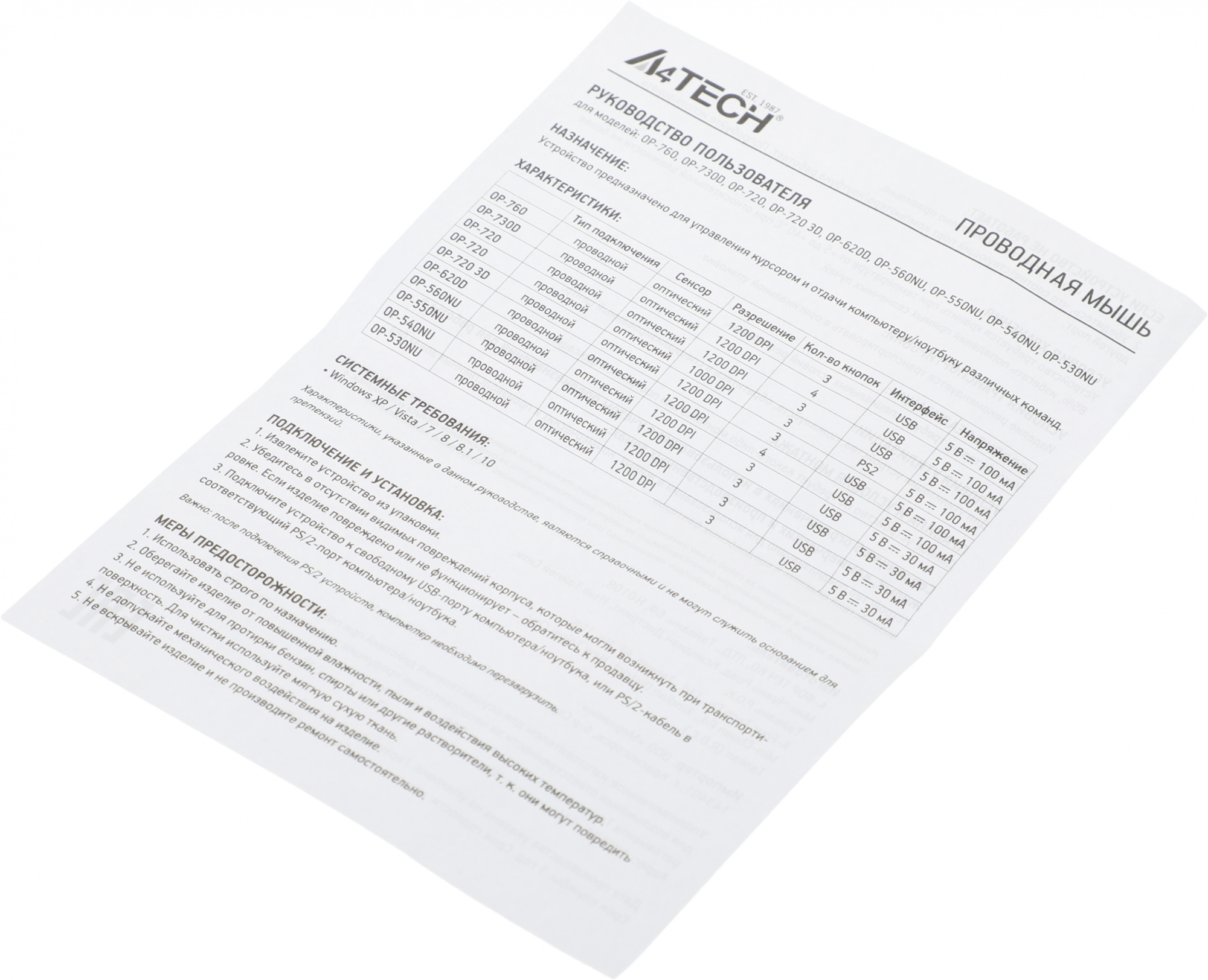 Мышь A4Tech - OP-530NU, Проводная, USB, Optical, 1200 - 1200 dpi, 2 btns, цвет чёрный, OP-530NU