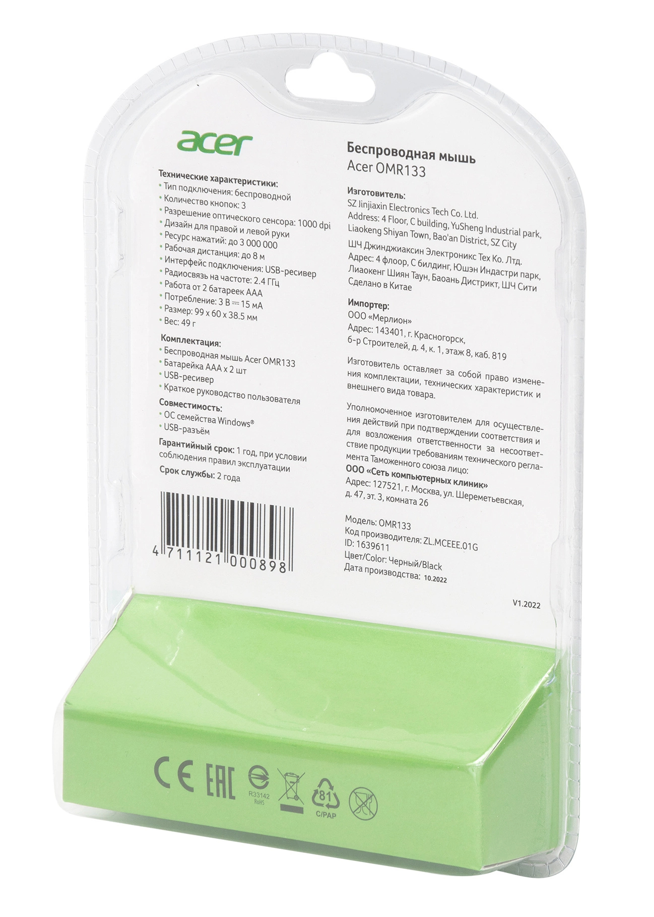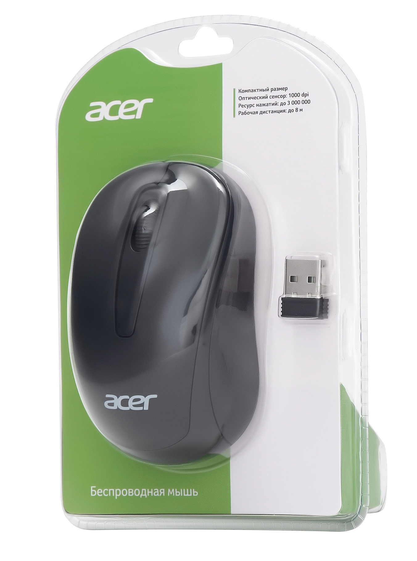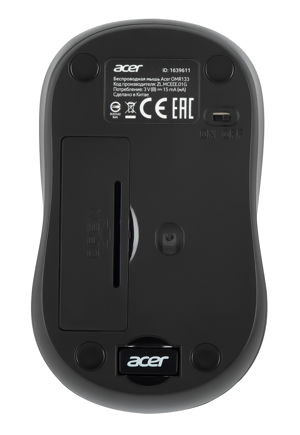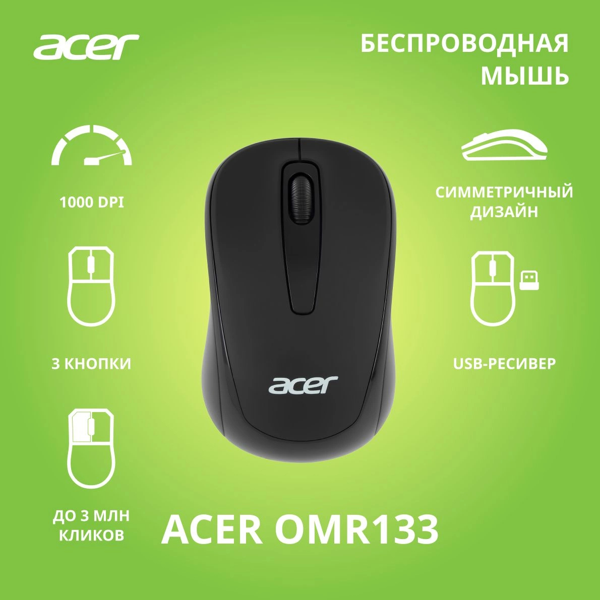 Мышь Acer - OMR133, Беспроводная, 10 метров, Optical, 1000 dpi, 2 btns, цвет чёрный, ZL.MCEEE.01G