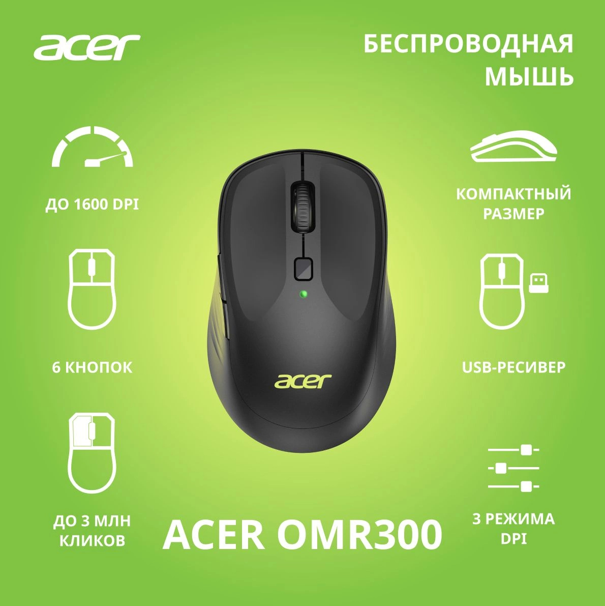 Мышь Acer - OMR300, Беспроводная, Optical, цвет чёрный, ZL.MCECC.01R