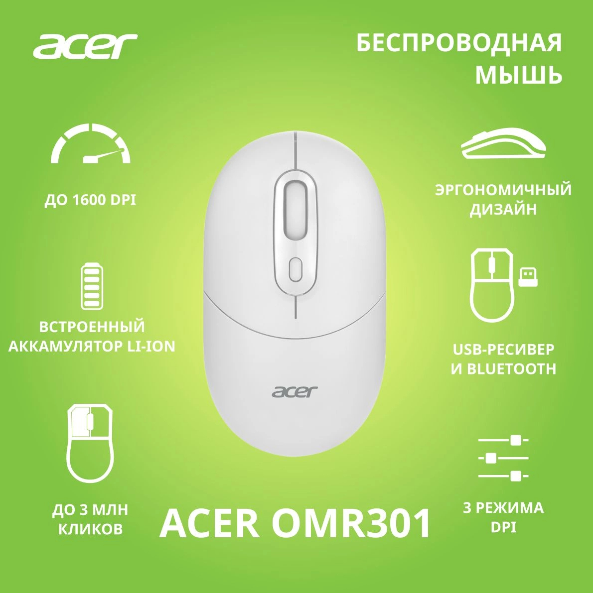 Мышь Acer - OMR301, Беспроводная, 10 метров, USB, Optical, 800 - 1600 dpi, 4 btns, цвет белый, ZL.MCECC.01U