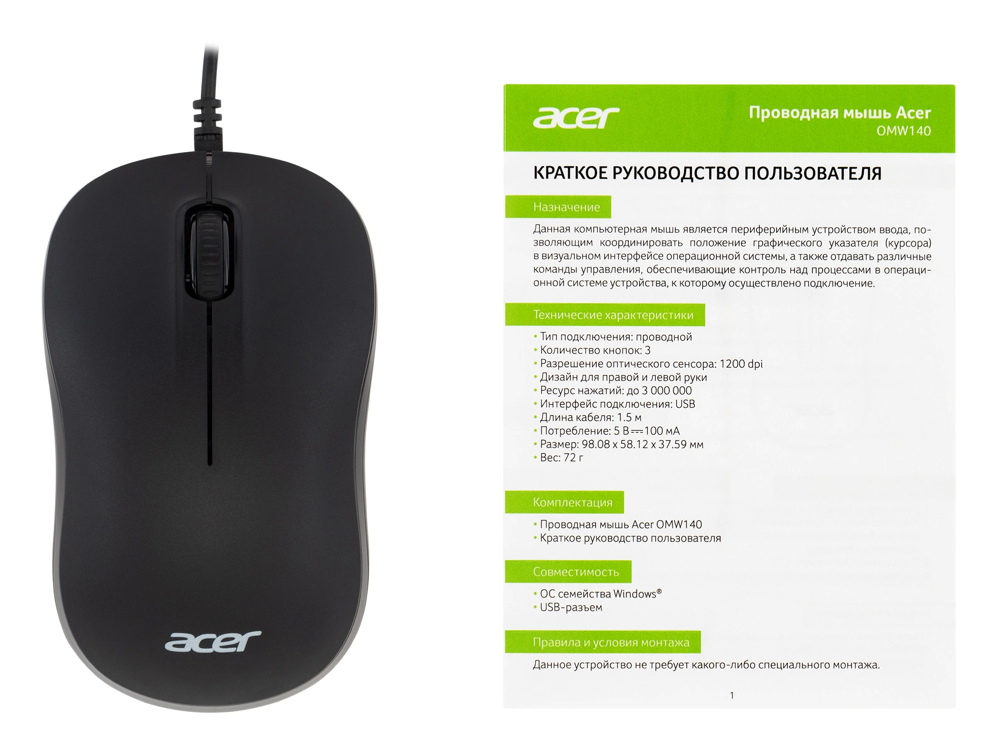 Выбрать товарыМышь Acer - OMW140, Проводная, USB, Optical, 1200 dpi, 3 btns, цвет чёрный, ZL.MCEEE.00L