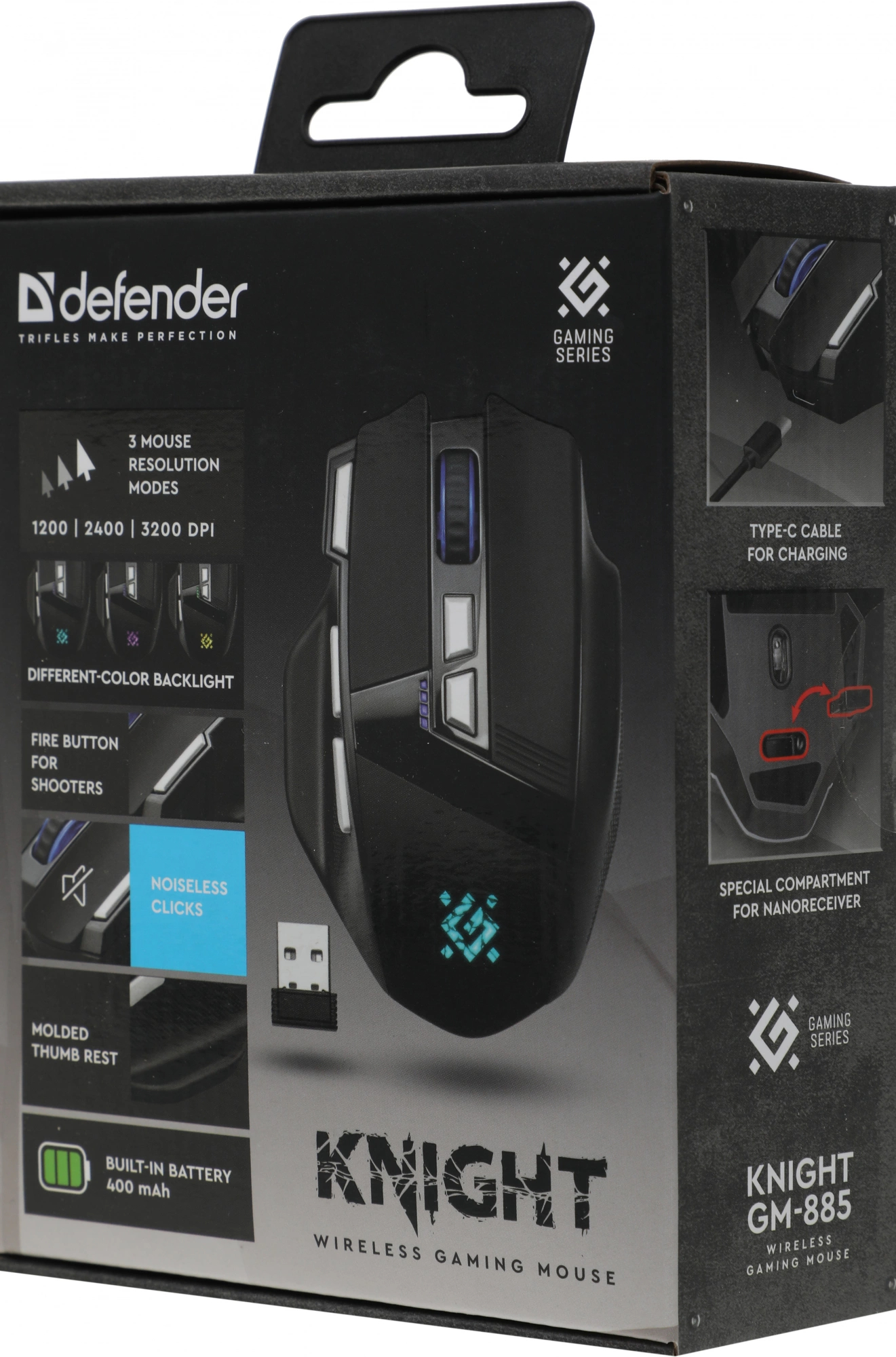 Мышь DEFENDER - Knight GM-885, Проводная/беспроводная, 10 метров, USB, Optical, 1200 - 3200 dpi, 7 btns, gaming, цвет чёрный, 52885