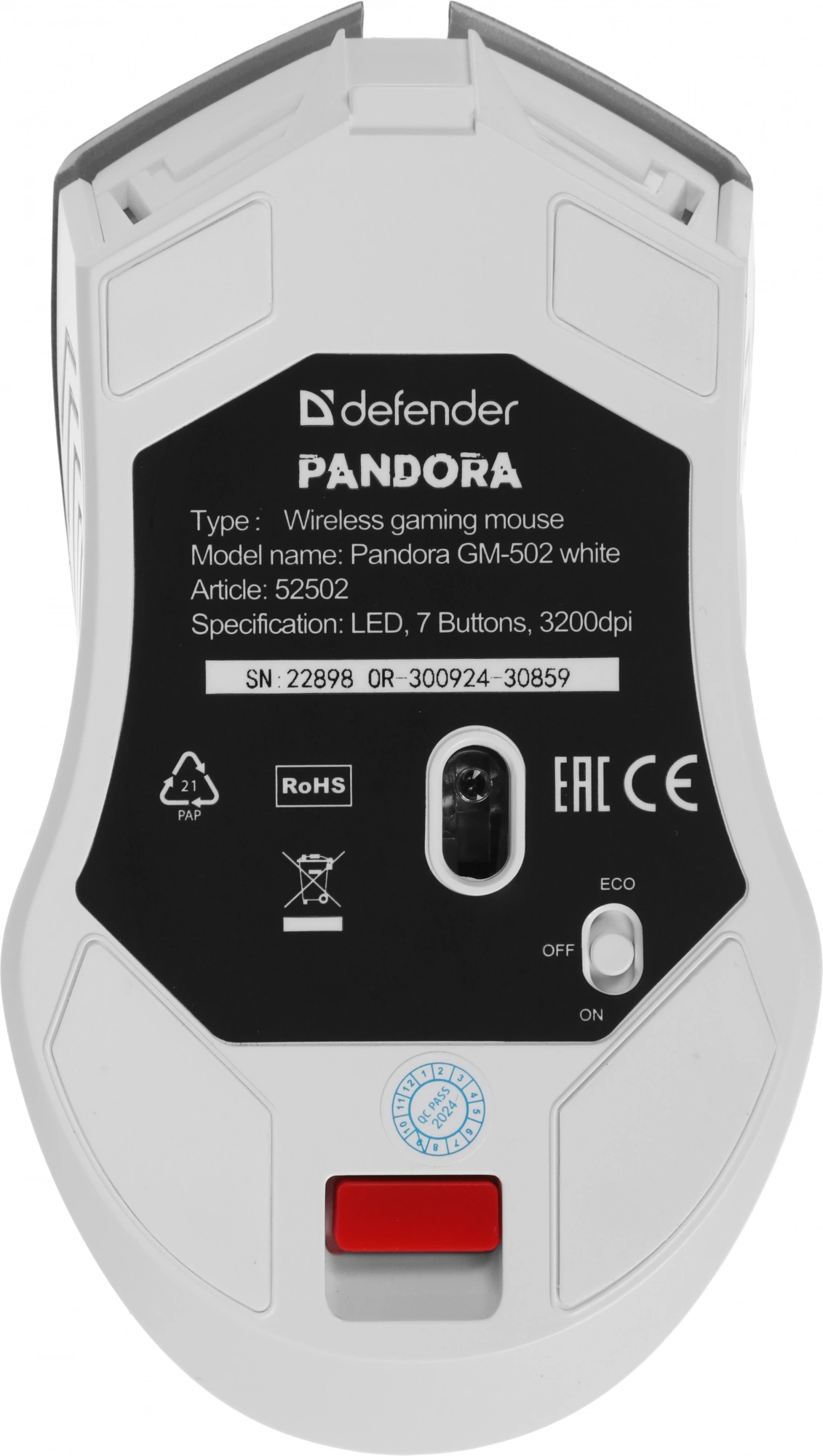 Мышь DEFENDER - Pandora GM-502, Беспроводная, 10 метров, USB, Optical, 1200 - 3200 dpi, 6 btns, gaming, цвет белый, 52502