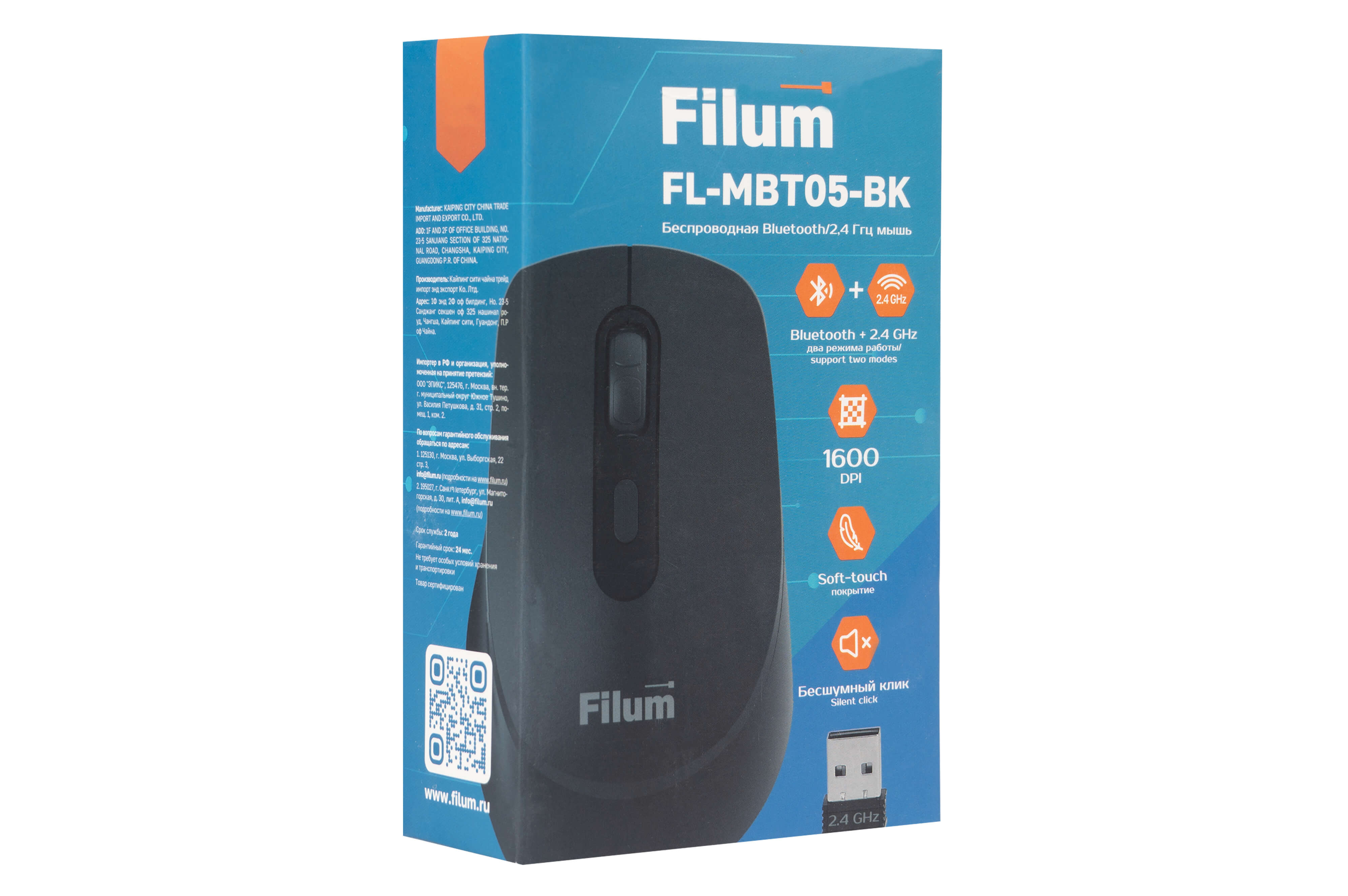 Мышь Filum - MBT05, Беспроводная, Optical, 800 dpi, 4 btns, цвет чёрный, FL-MBT05-BK