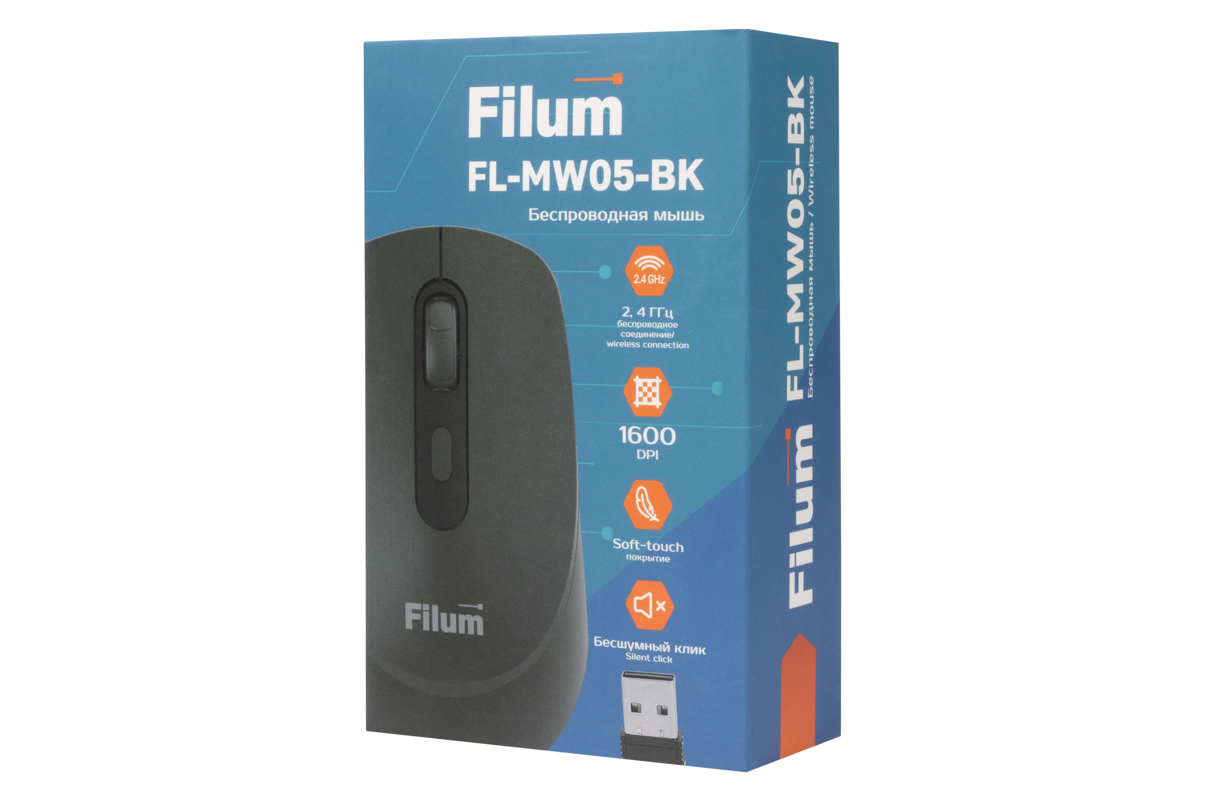 Мышь Filum - MW05, Беспроводная, 2.4 ГГц, Optical, 800 dpi, 4 btns, цвет чёрный, FL-MW05-BK