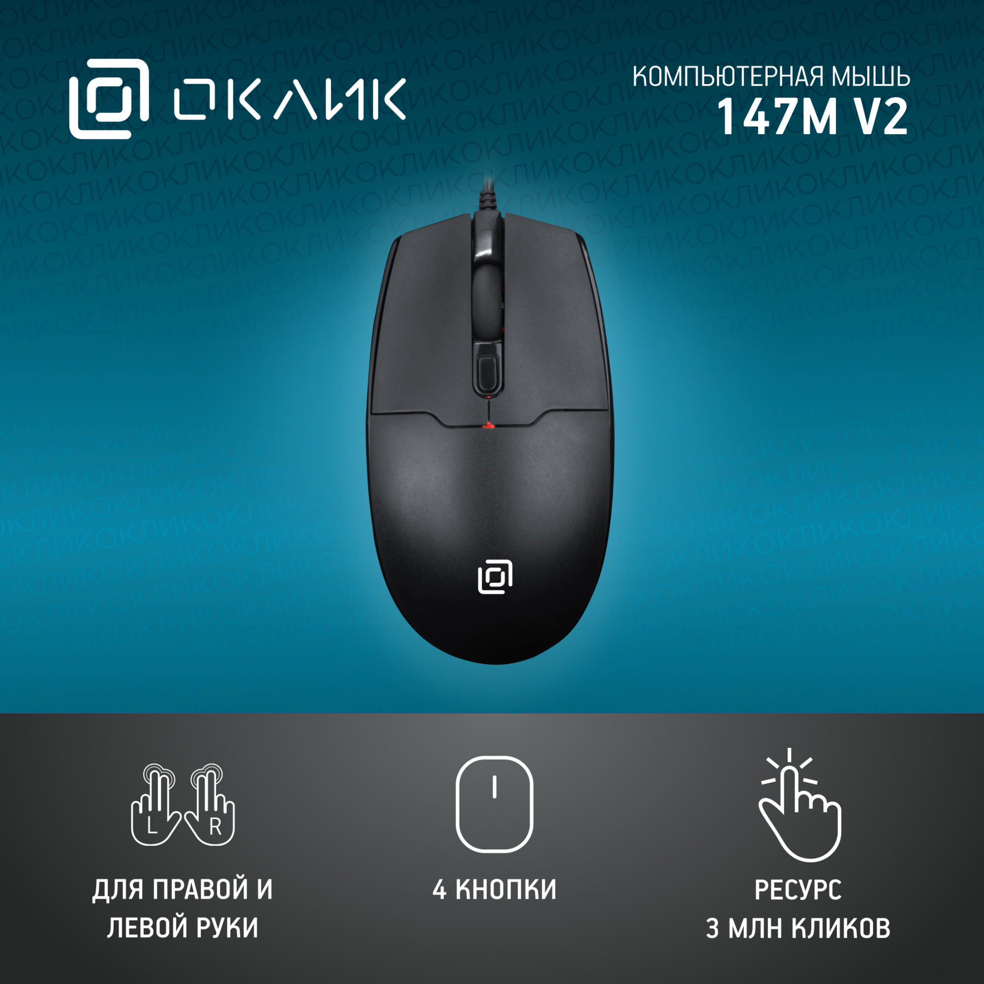 Мышь OKLICK - 147M V2, Проводная, USB, Optical, 4 btns, цвет чёрный, 1580834