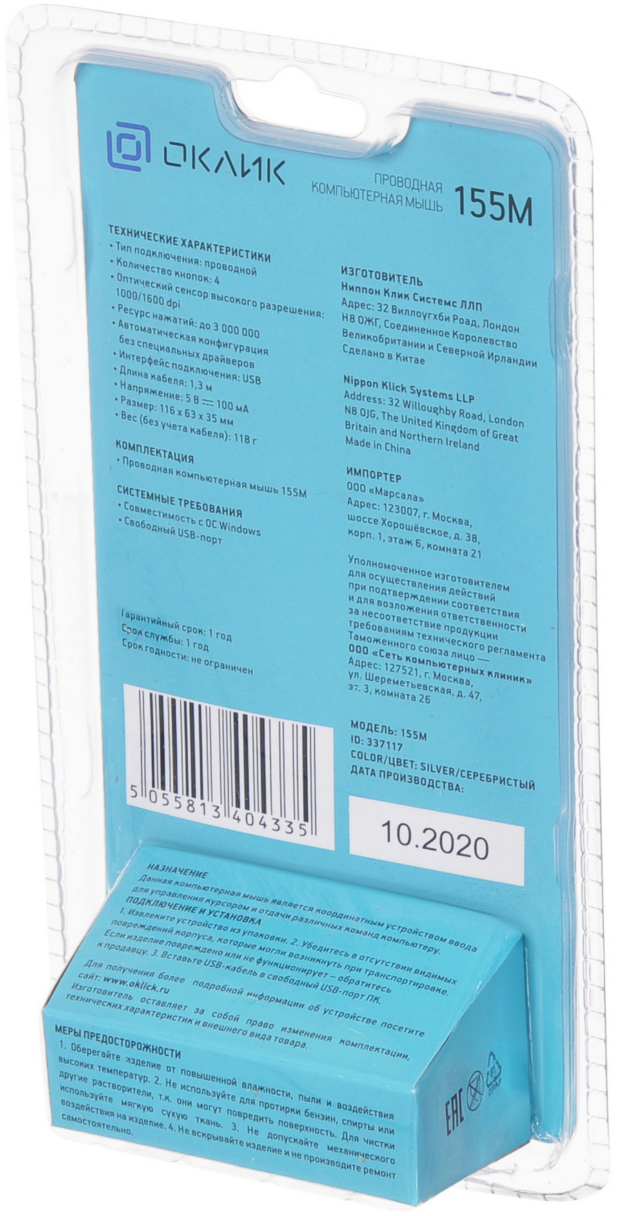 Мышь OKLICK - 155M, Проводная, USB, Optical, 4 btns, цвет серебристый, 337117