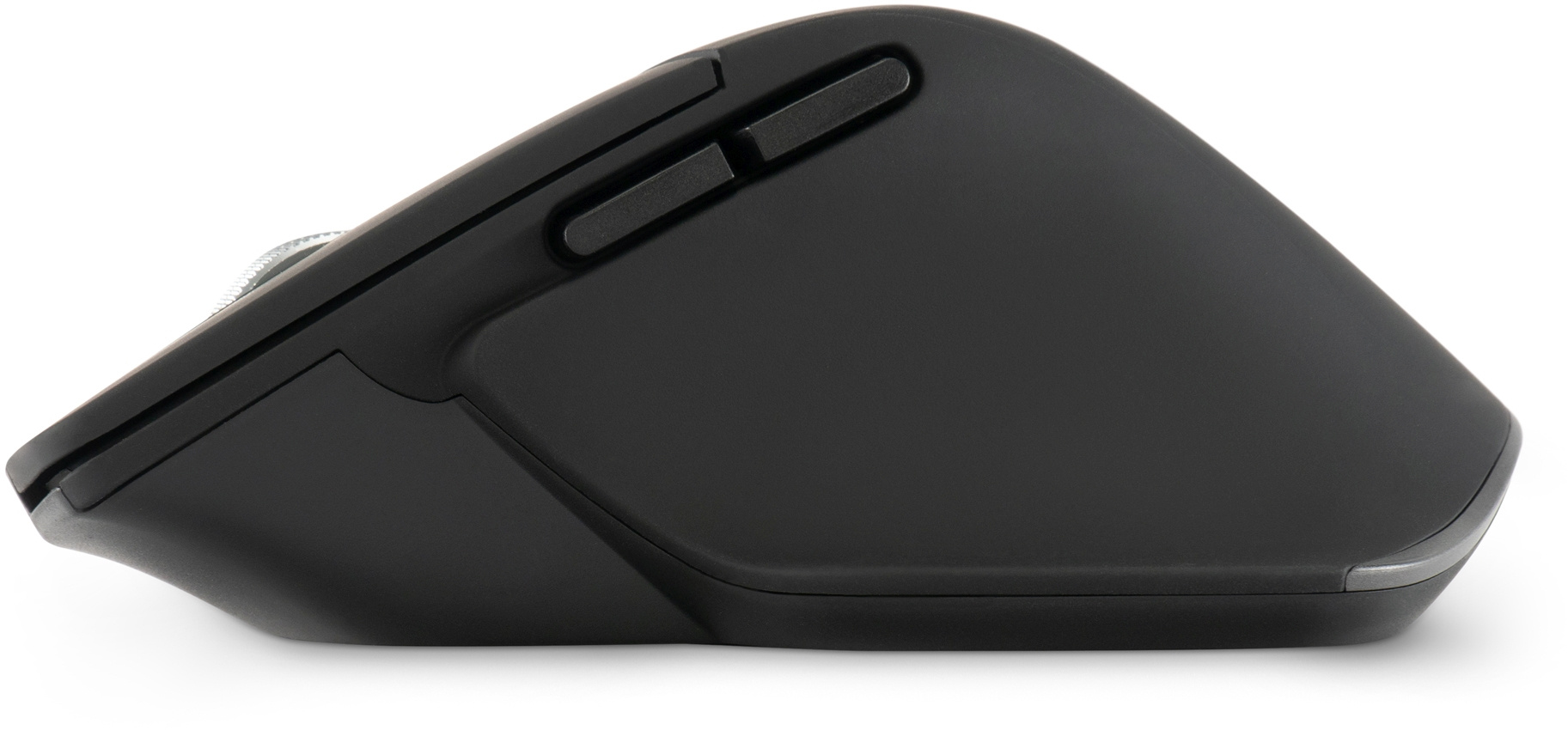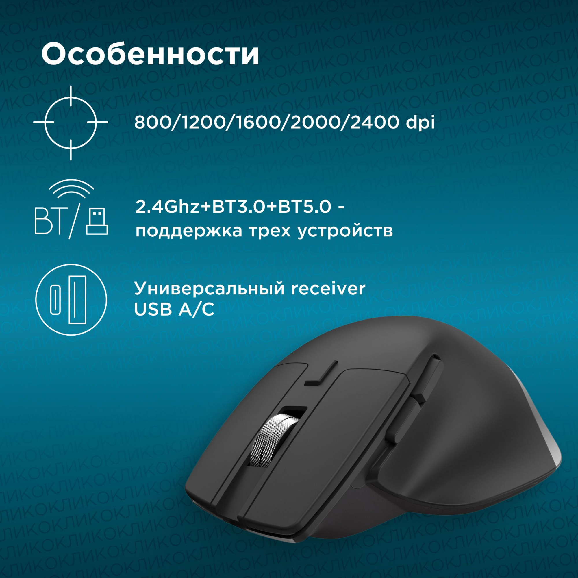 Серый корпус с резиновыми вставками. Беспроводное подключение через USB-приемник. Кнопки с мягким нажатием. Сенсор работает на стекле.