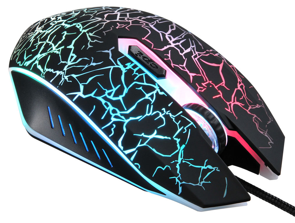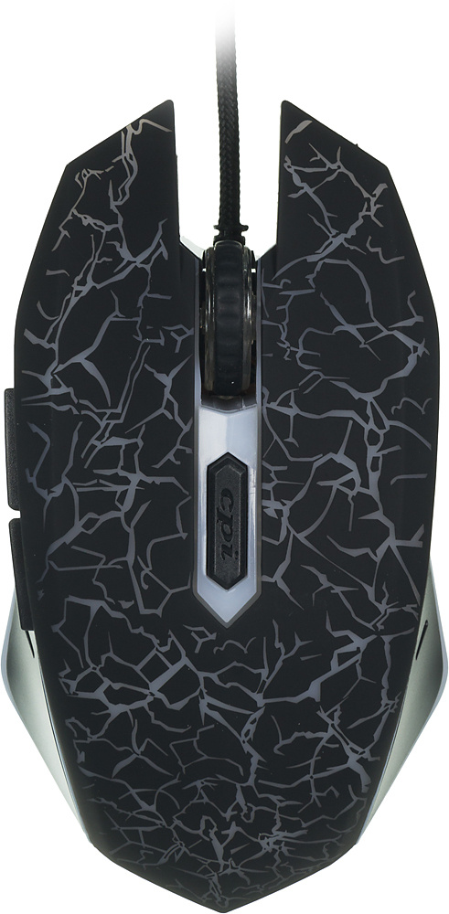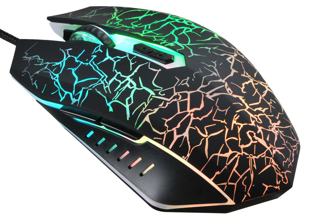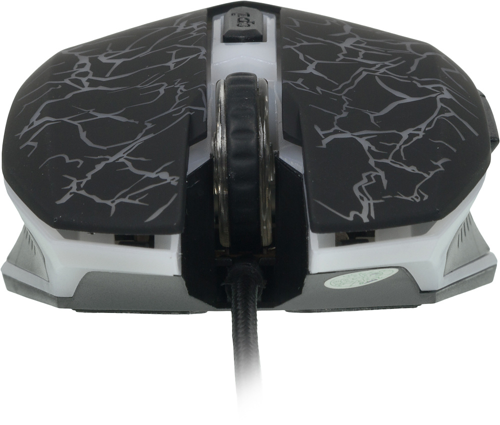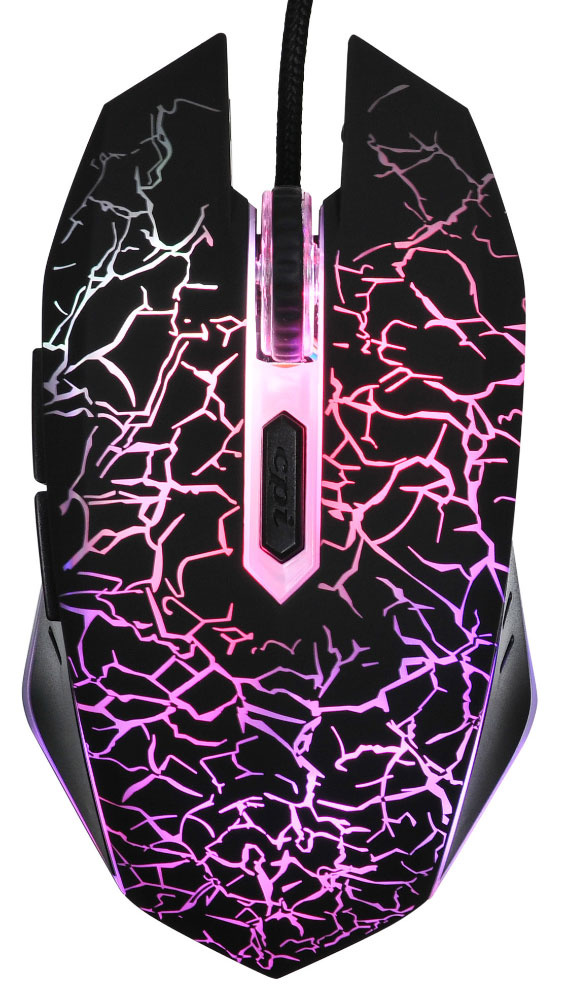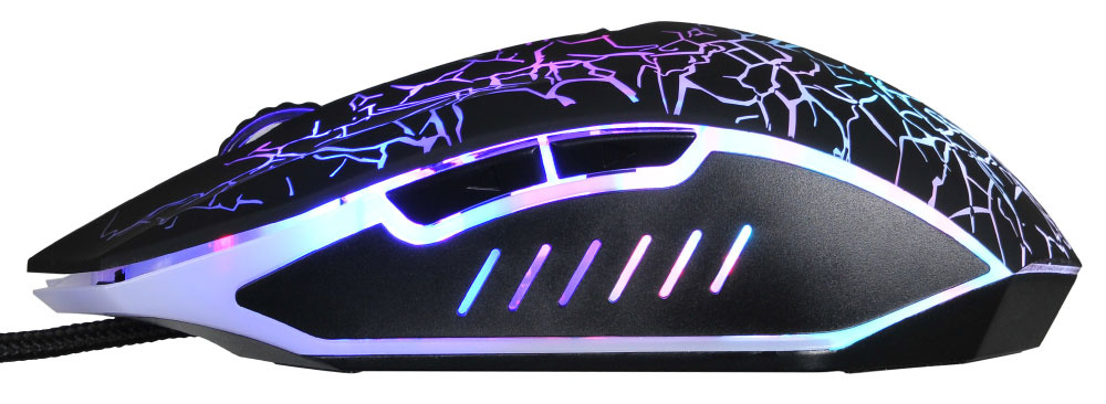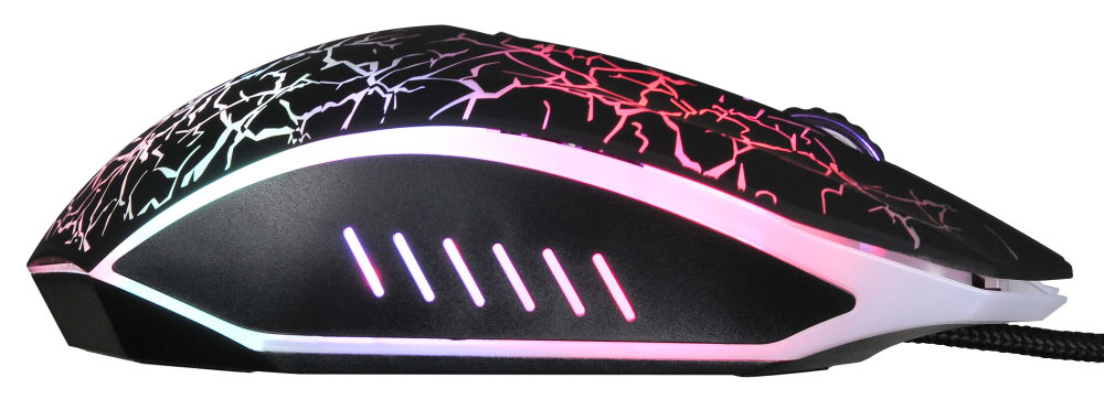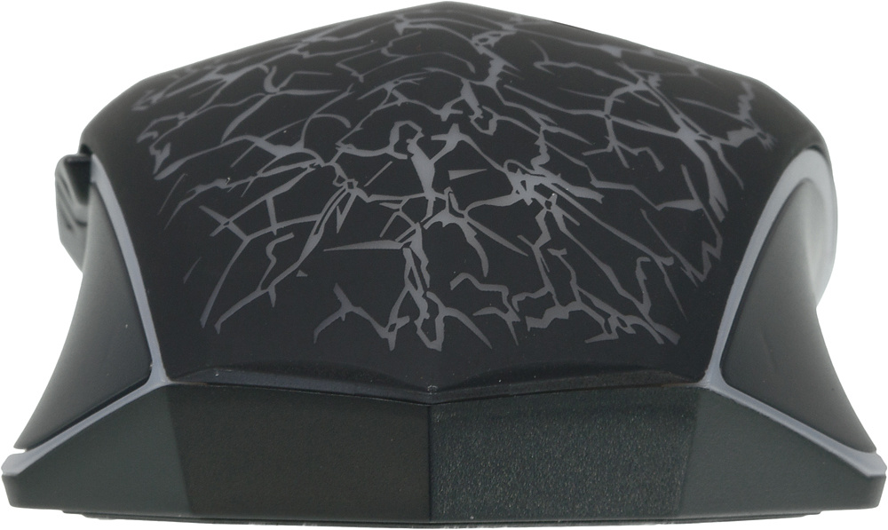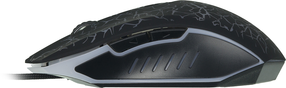 Игровая мышь с агрессивным узором, подсветка привлекает внимание в тёмной комнате. Проводная, поэтому нет задержек в динамичных играх. Сенсор достаточно высокоточный, можно изменять чувствительность. Боковые кнопки добавляют удобства.