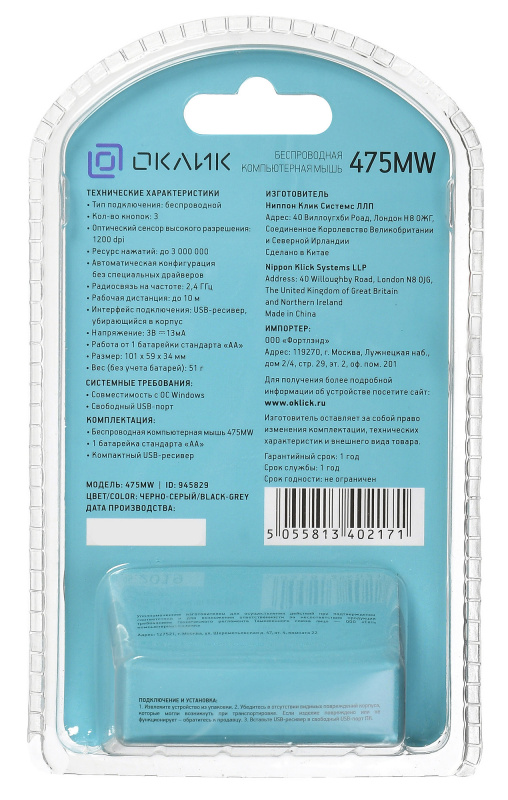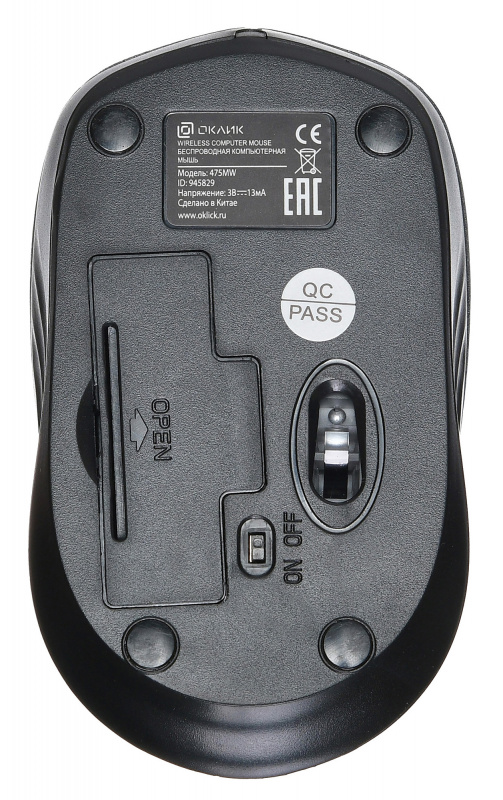 Мышь OKLICK - 475MW, Беспроводная, Optical, 1000 dpi, 3 btns, цвет серый, 945829