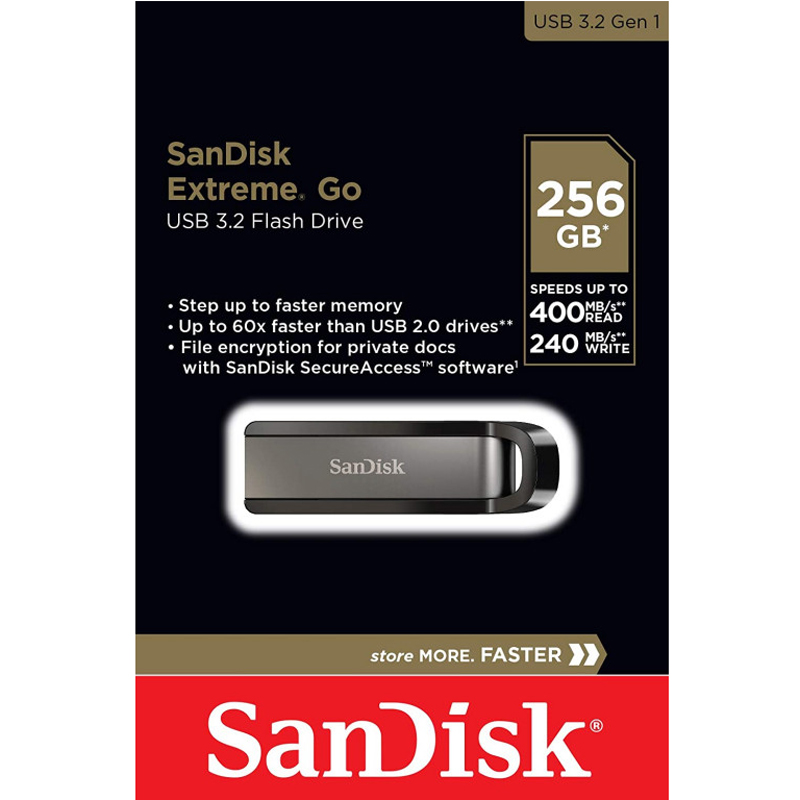USB накопитель SanDisk - Extreme Go, USB Type A (USB 3.2 Gen 1), 256 ГБ, write speed-240MB/s, read speed-400MB/s, цвет чёрный, SDCZ810-256G-G46