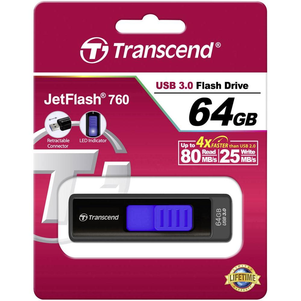 USB накопитель Transcend - JetFlash 760, USB Type A (USB 3.2 Gen 1), 64 ГБ, write speed-25MB/s, read speed-80MB/s, цвет чёрно-синий, TS64GJF760