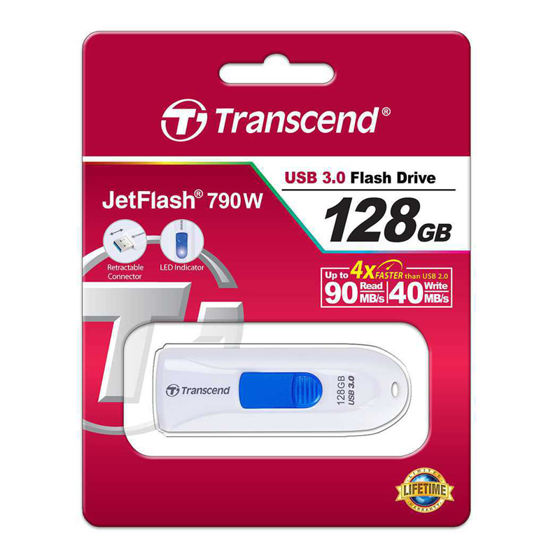 USB накопитель Transcend - JetFlash 790, USB Type A (USB 3.2 Gen 1), 128 ГБ, write speed-40MB/s, read speed-90MB/s, цвет белый, TS128GJF790W