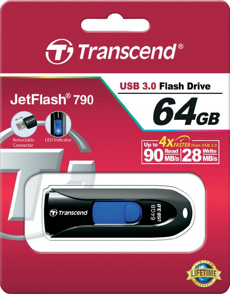 USB накопитель Transcend - JetFlash 790, USB Type A (USB 3.2 Gen 1), 64 ГБ, write speed-28MB/s, read speed-90MB/s, цвет чёрно-синий, TS64GJF790K