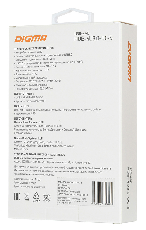 USB-хаб Digma - HUB-4U3.0-UC-S, USB Type C, 4-USB3.0 Type A, цвет серебристый, HUB-4U3.0-UC-S
