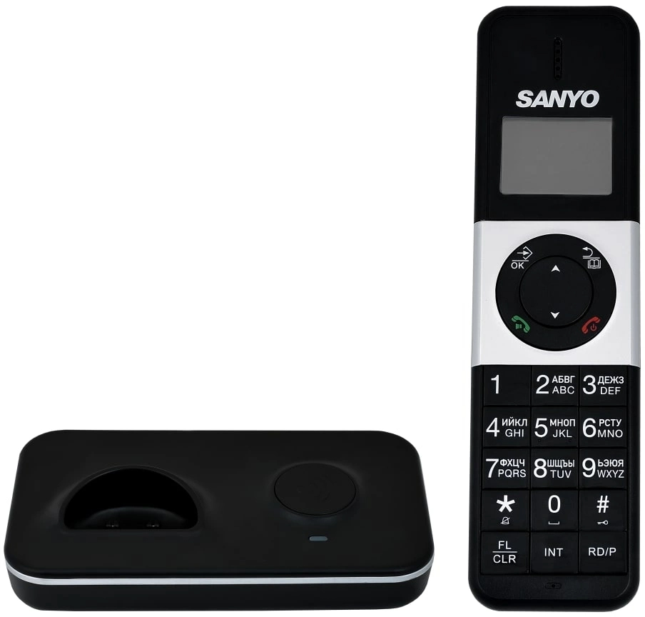 Бренд Sanyo предлагает базовый DECT-телефон, две трубки возможно (if 1002?), чёрный лаконичный дизайн. Настройки на русском, Caller ID, громкая связь.
